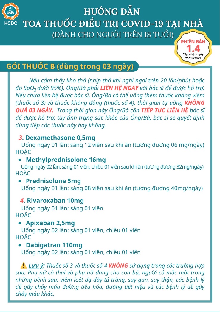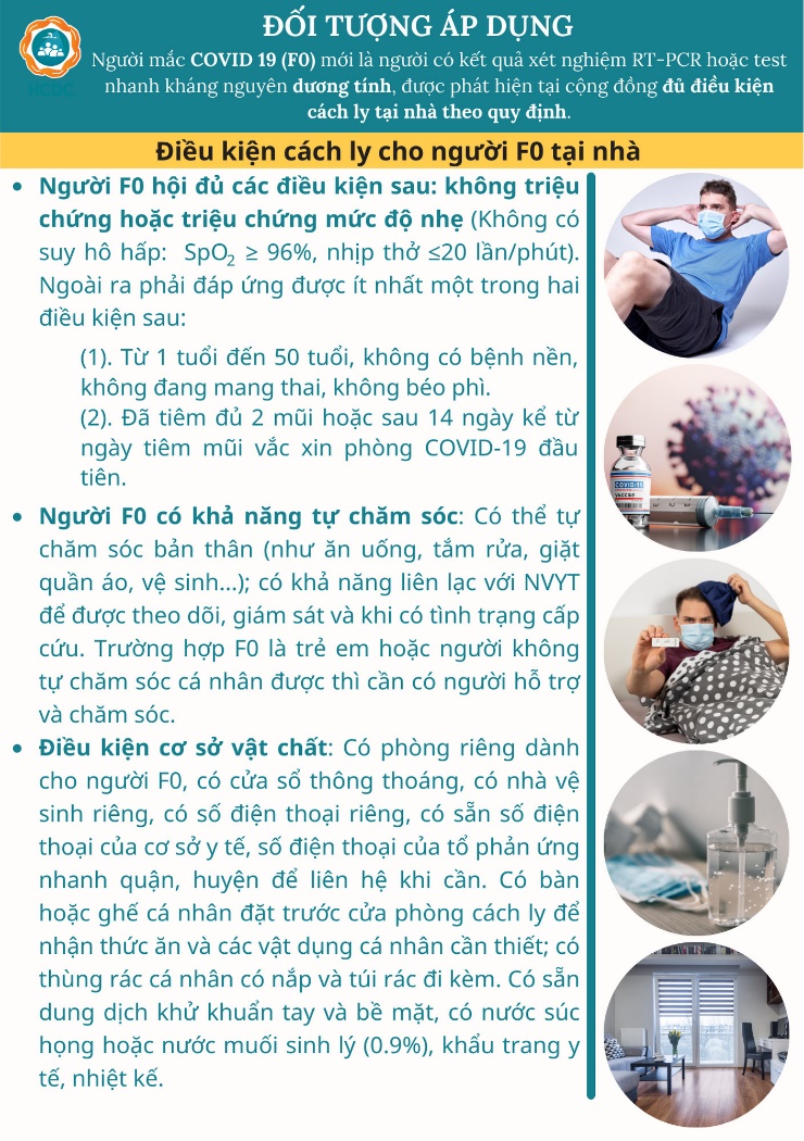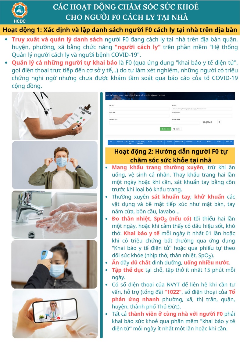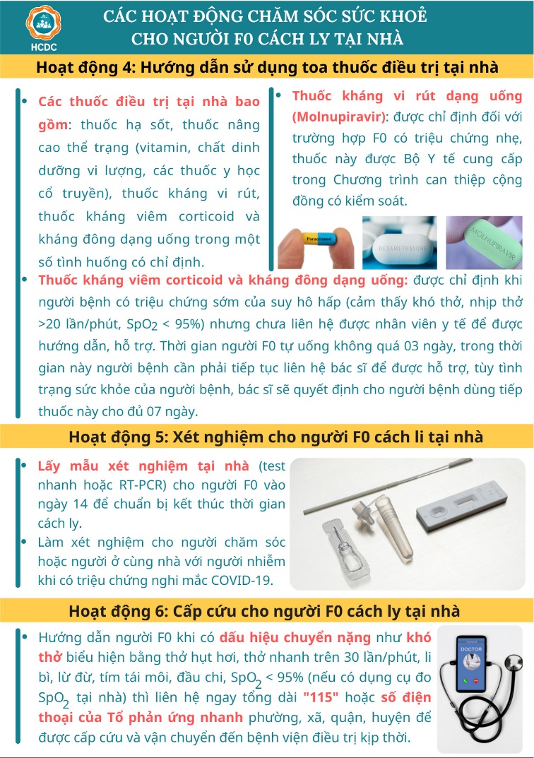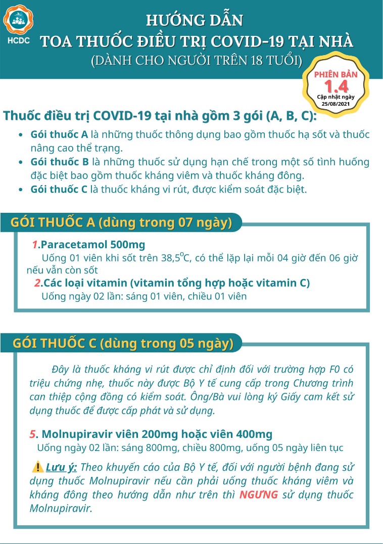 Ngày 25/8, Sở Y tế TP. Hồ Chí Minh đã có văn bản khẩn cập nhật "Hướng dẫn gói chăm sóc sức khỏe tại nhà cho người F0" (phiên bản 1.4). Theo đó có bổ sung hoạt động của Trạm Y tế lưu động, điều kiện cách ly tại nhà và điều chỉnh về hướng dẫn sử dụng thuốc tại nhà cho F0.