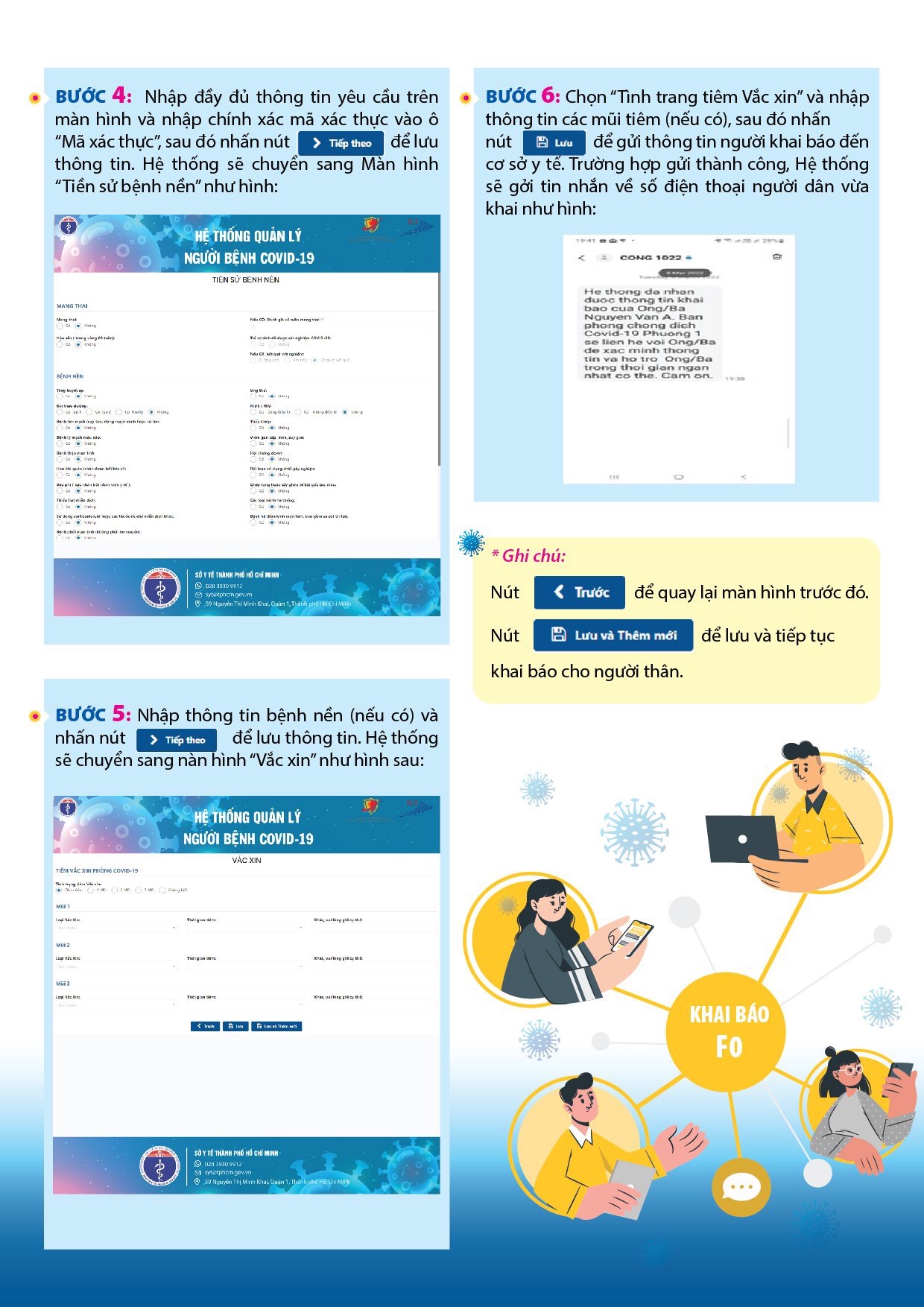 Hiện nay, người dân khi có triệu chứng nghi mắc COVID-19, thực hiện xét nghiệm nhanh tại nhà, nếu có kết quả dương tính thì đăng nhập vào địa chỉ https://khaibaof0.tphcm.gov.vn trên máy tính hoặc điện thoại thông minh để khai báo xác nhận là F0 và được cấp giấy xác nhận hoàn thành cách ly y tế tại nơi lưu trú.