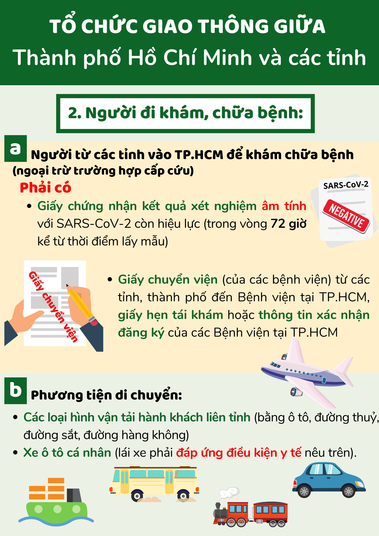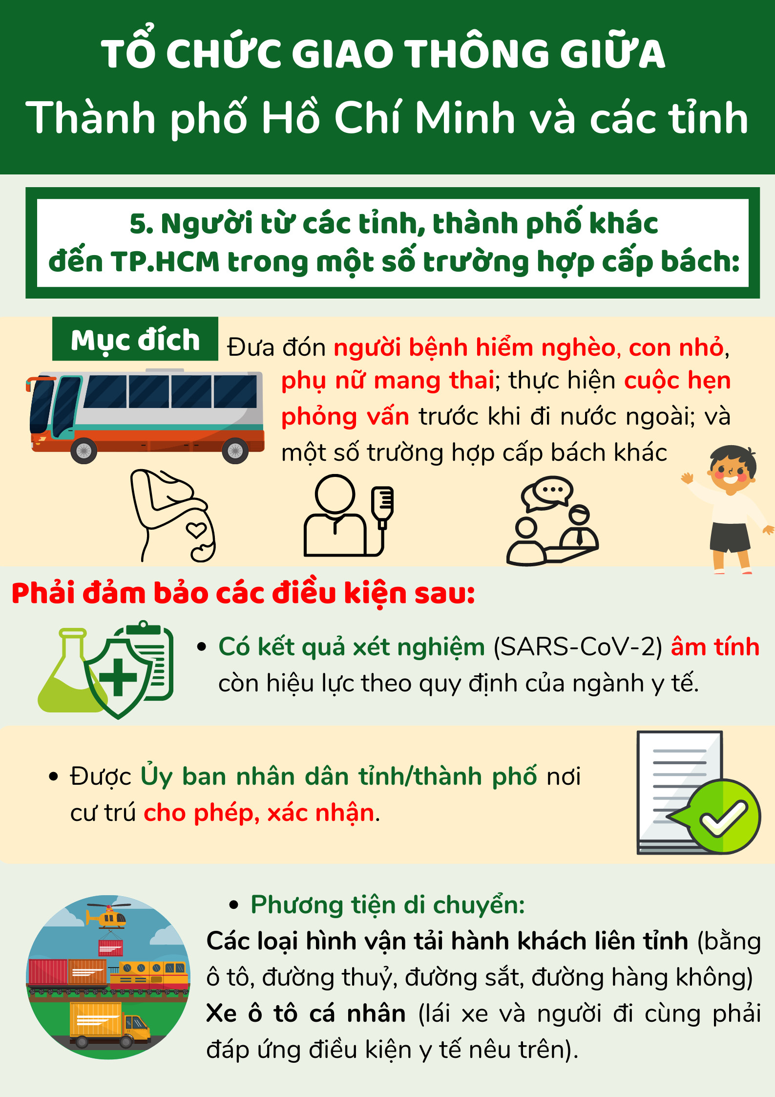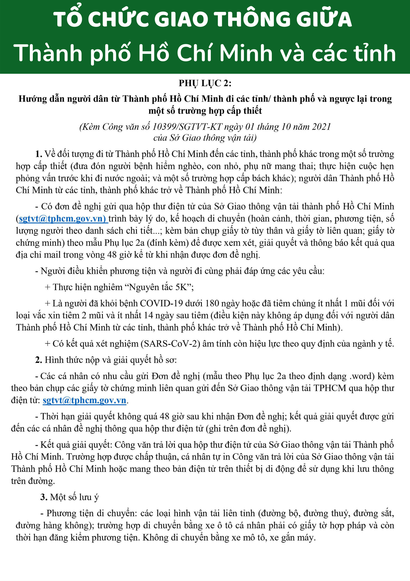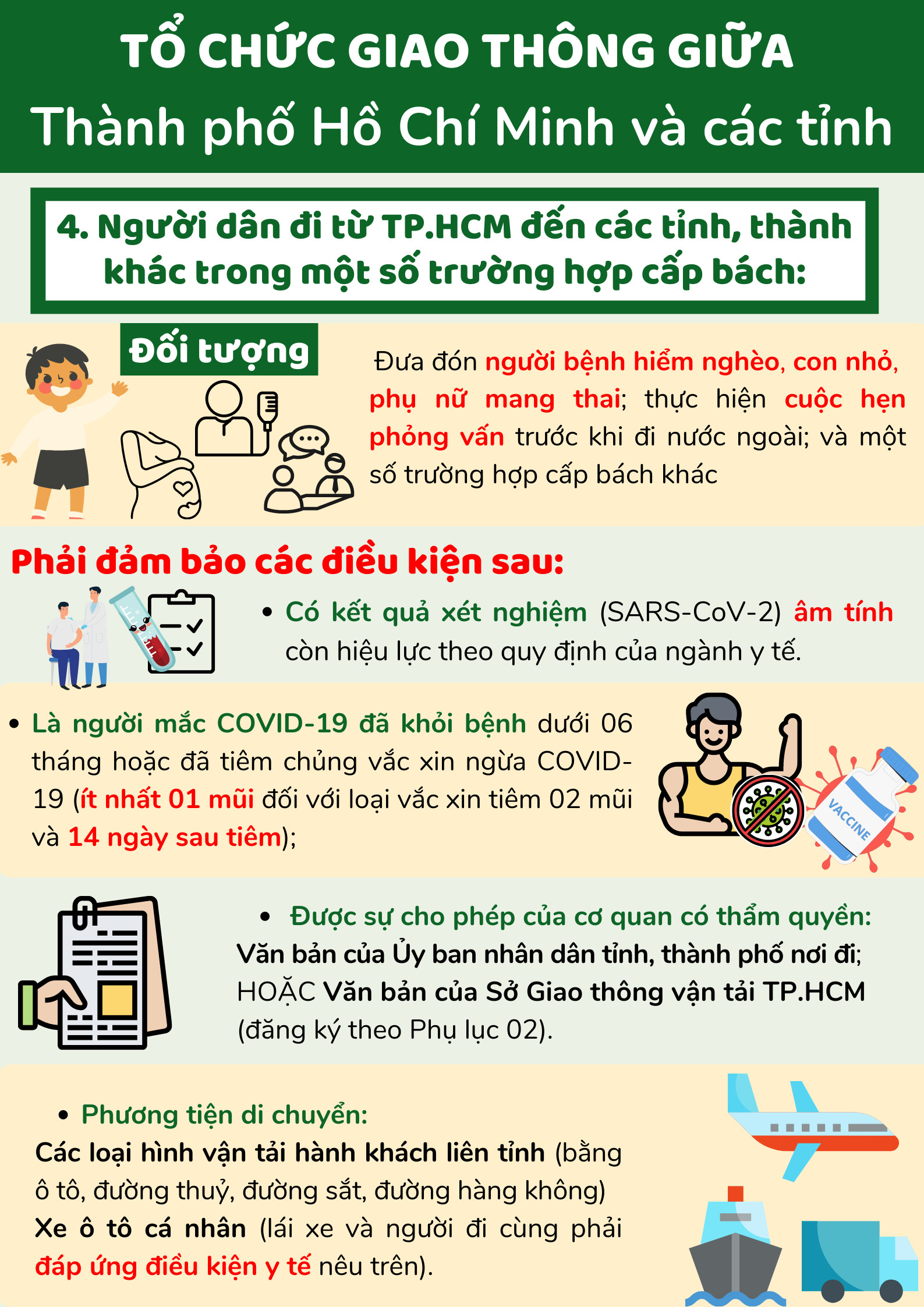 Sở GTVT TP.HCM đã có văn bản hướng dẫn người dân từ TP.HCM đi các tỉnh/thành phố và ngược lại trong một số trường hợp cấp thiết gồm đưa đón người bệnh hiểm nghèo, con nhỏ, phụ nữ mang thai; thực hiện cuộc hẹn phỏng vấn trước khi đi nước ngoài; và một số trường hợp cấp bách khác; người dân TP.HCM từ các tỉnh, thành phố khác trở về TP.HCM.