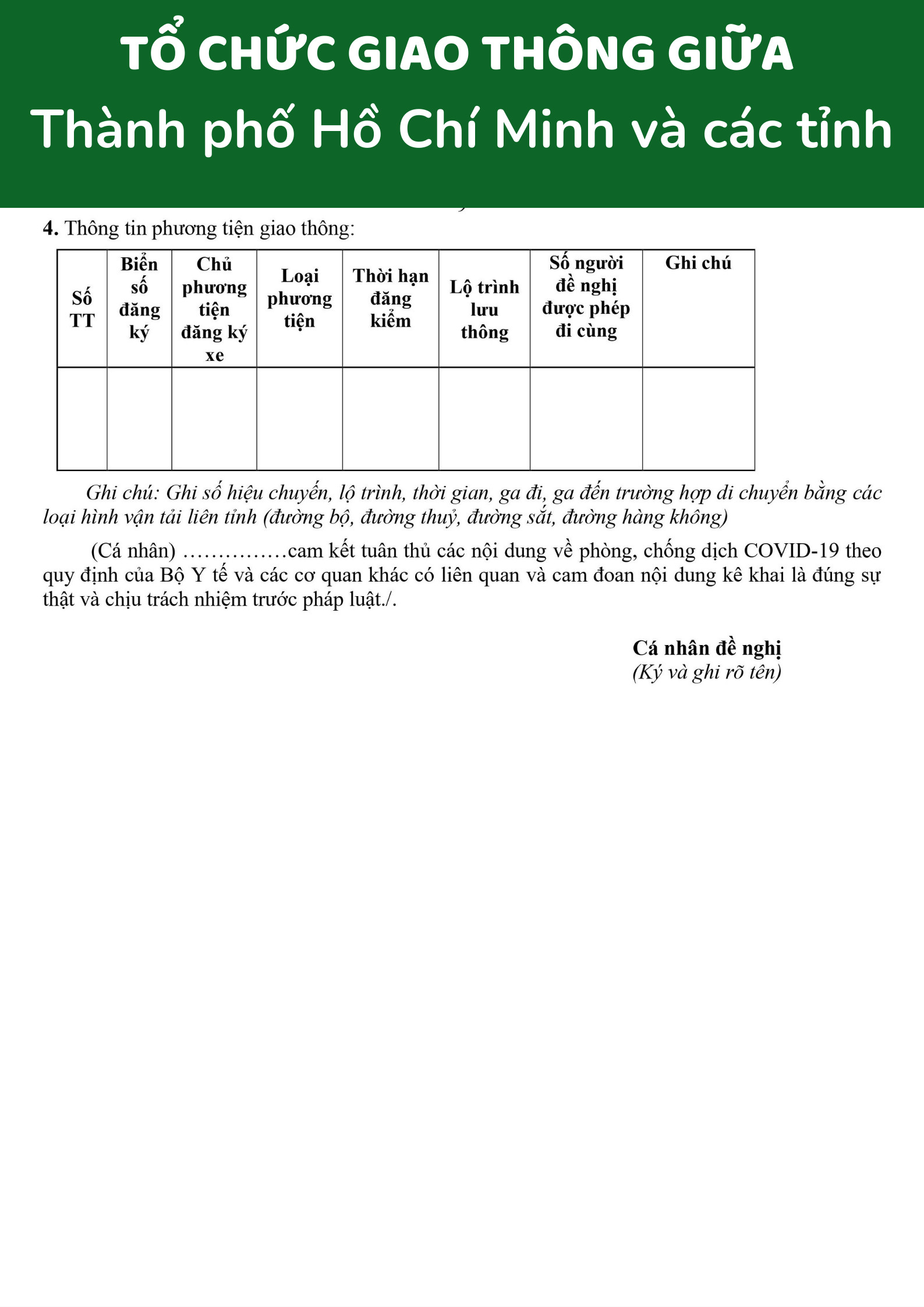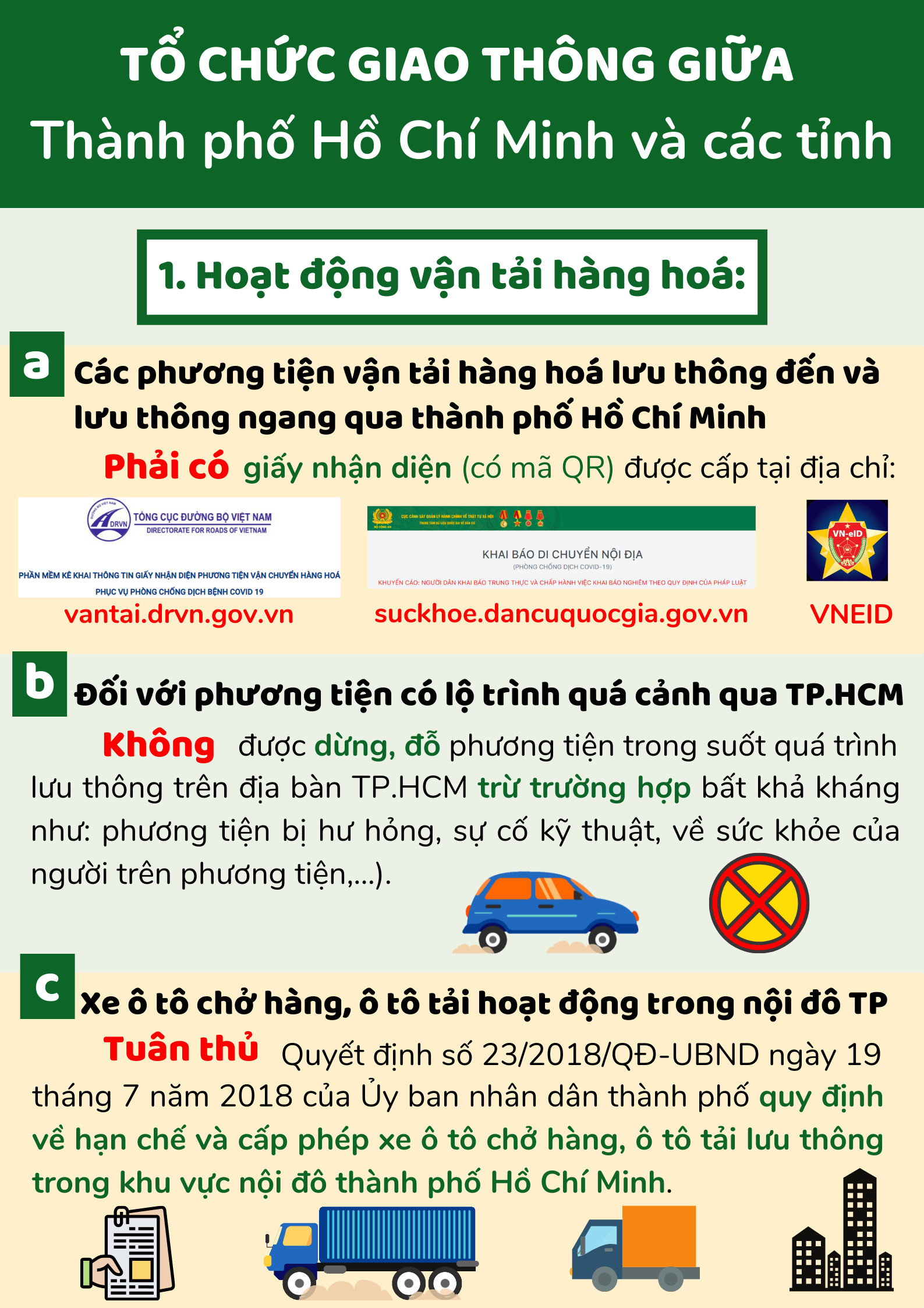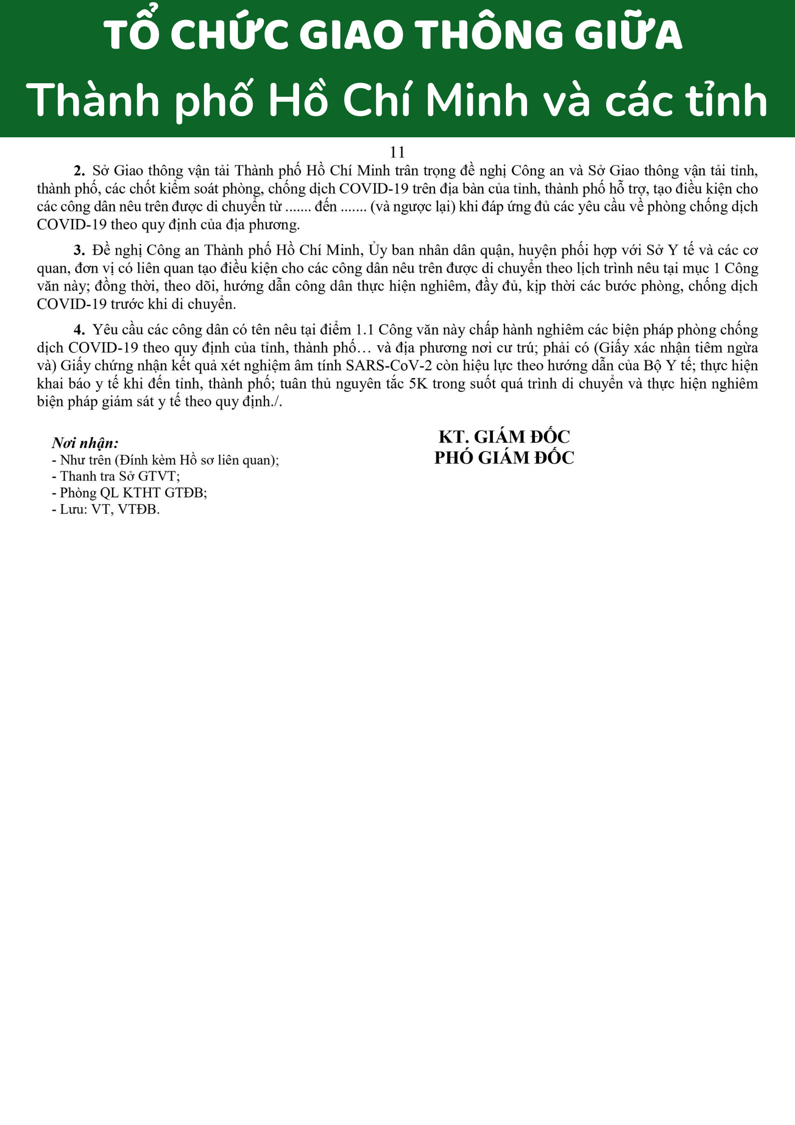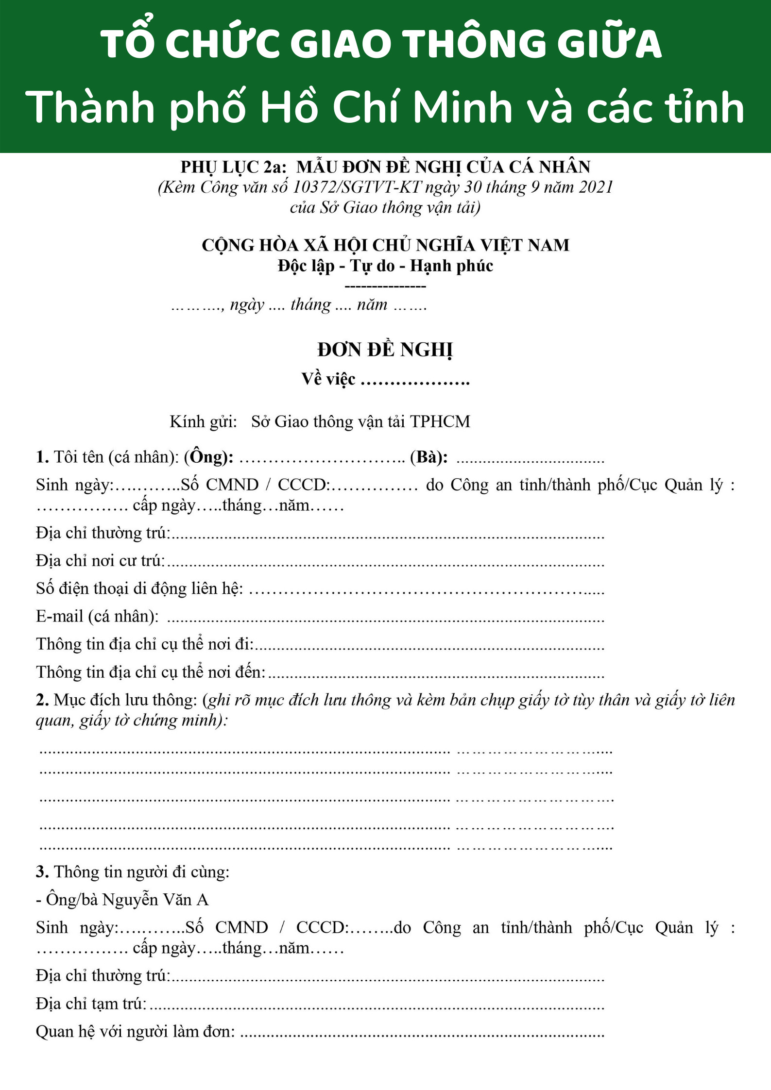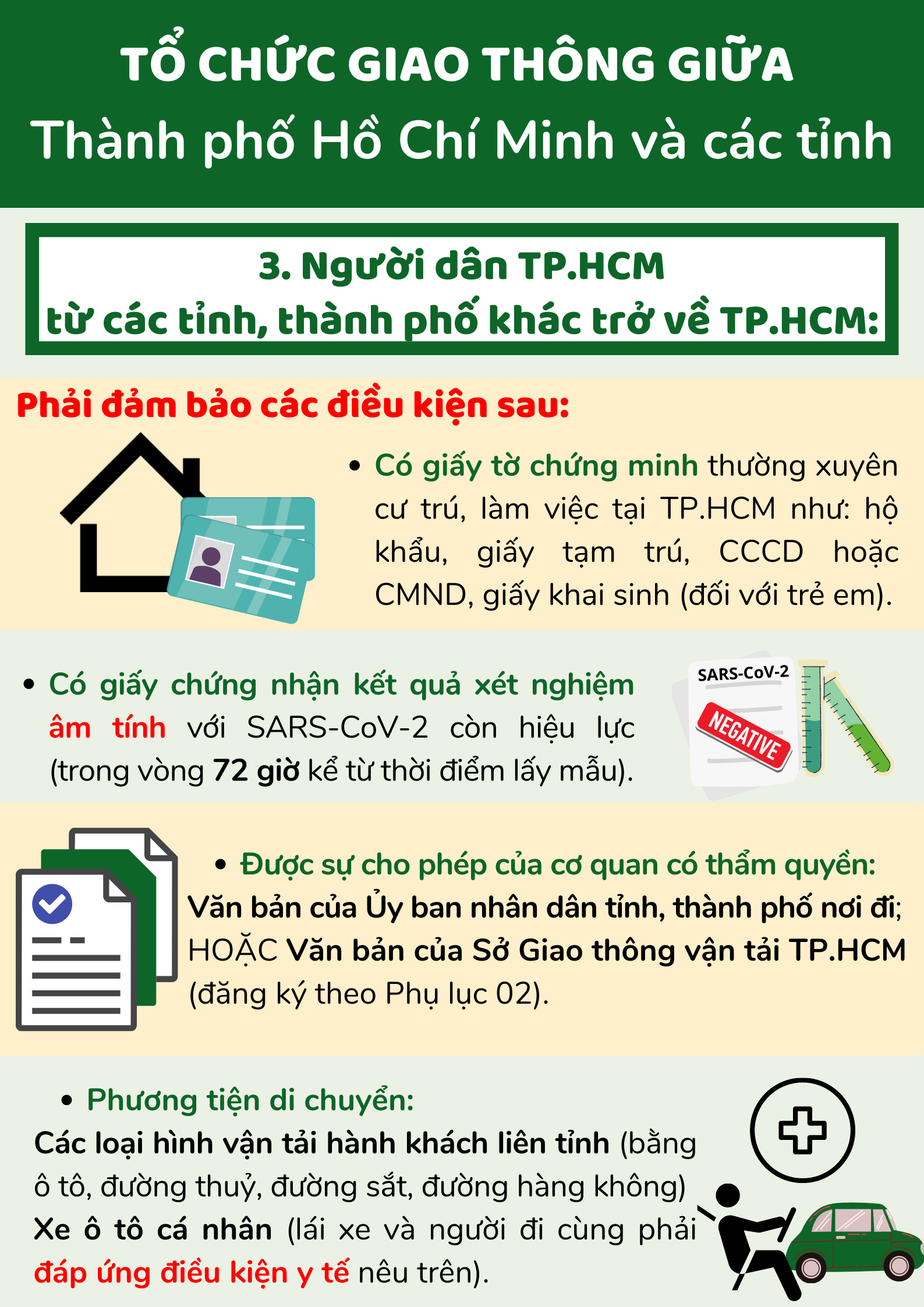 Sở GTVT TP.HCM đã có văn bản hướng dẫn người dân từ TP.HCM đi các tỉnh/thành phố và ngược lại trong một số trường hợp cấp thiết gồm đưa đón người bệnh hiểm nghèo, con nhỏ, phụ nữ mang thai; thực hiện cuộc hẹn phỏng vấn trước khi đi nước ngoài; và một số trường hợp cấp bách khác; người dân TP.HCM từ các tỉnh, thành phố khác trở về TP.HCM.