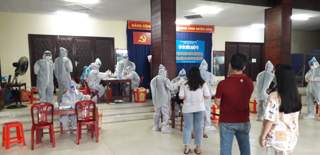 Điểm lấy mẫu tại trụ sở Trạm Y tế thị trấn và Trung tâm văn hoá huyện do Bệnh viện Chấn thương Chỉnh hình hỗ trợ