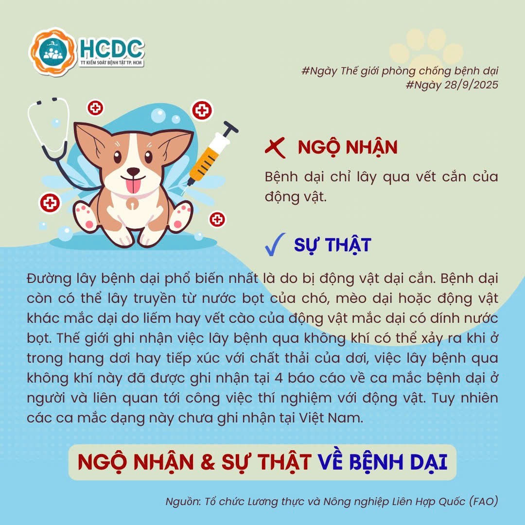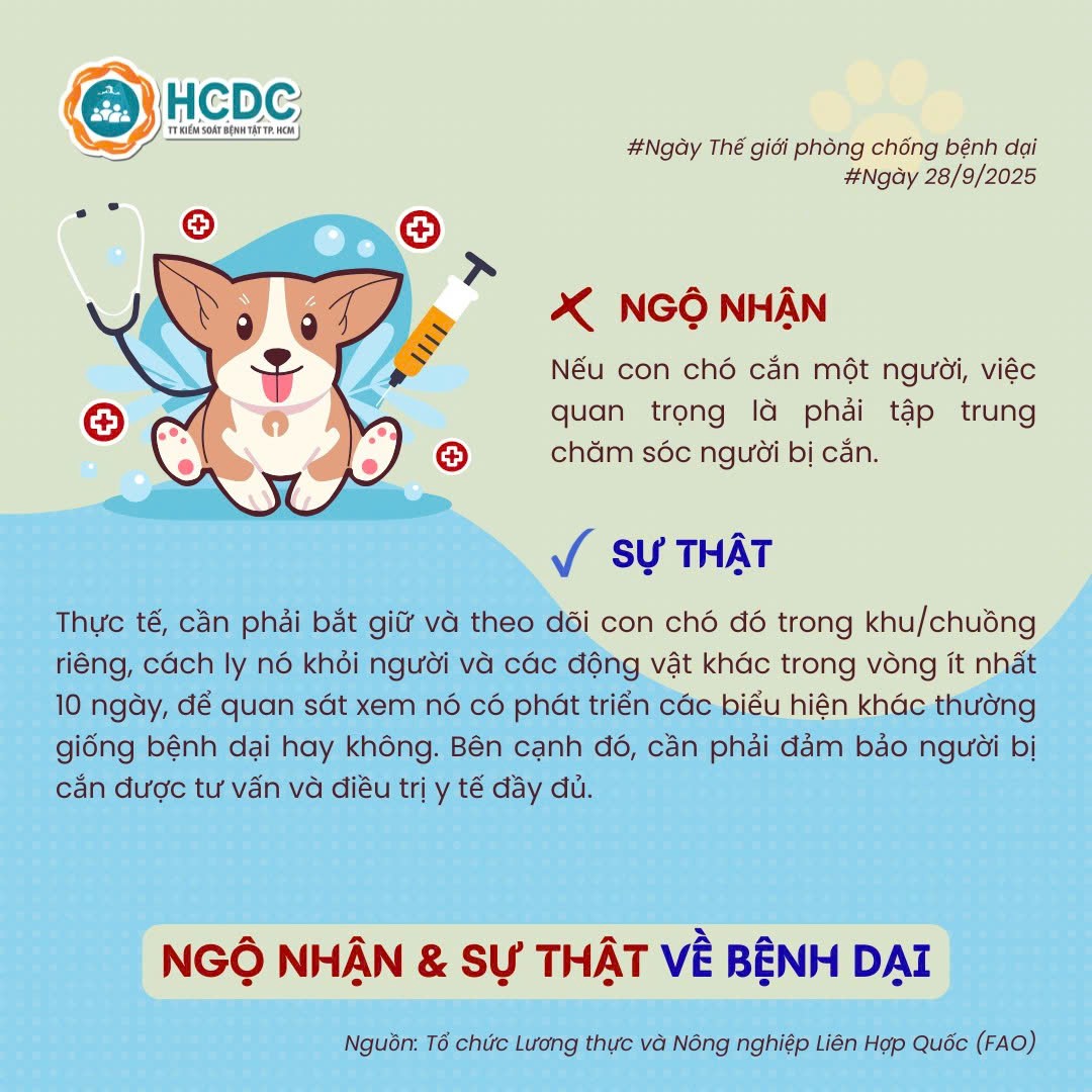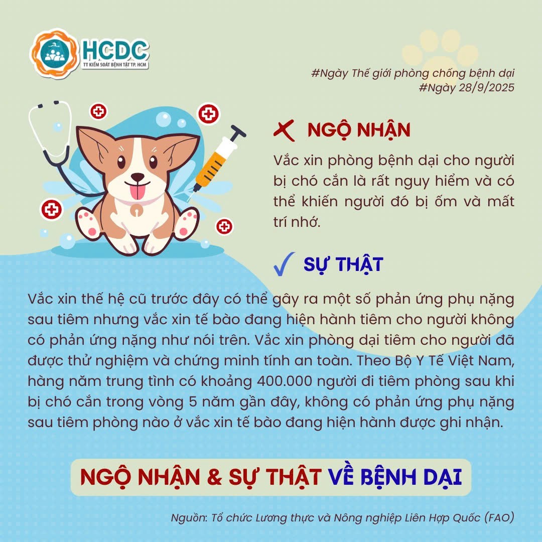 Hưởng ứng Ngày Thế giới phòng chống bệnh Dại 28/9/2025! Trung tâm Kiểm soát bệnh tật Thành phố Hồ Chí Minh (HCDC) đã tổng hợp các ngộ nhận và sự thật về bệnh dại mà mọi người cần biết. Hãy xem ngay bộ infographic này để nắm rõ cách xử trí vết thương, tiêm vắc xin và phòng ngừa hiệu quả các bạn nhé!