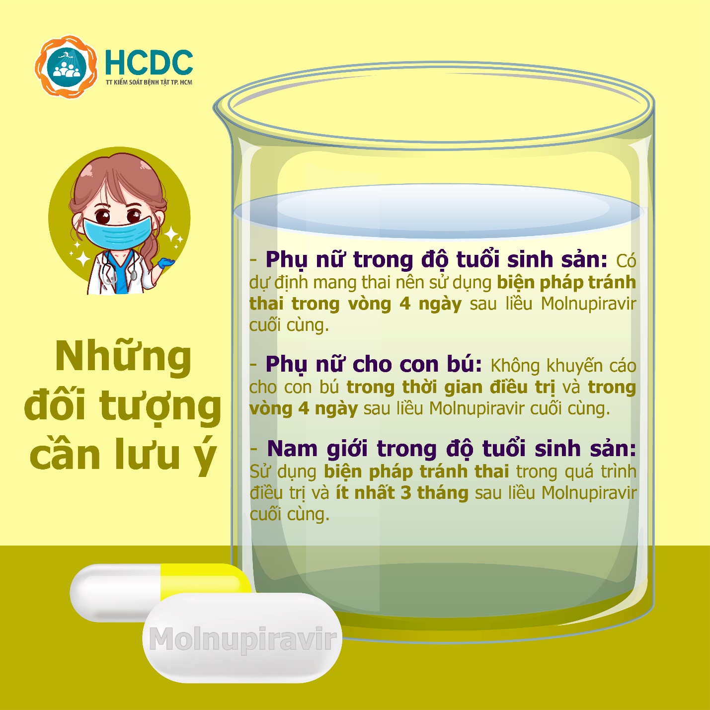 - Nam giới trong độ tuổi sinh sản: Sử dụng biện pháp tránh thai trong quá trình điều trị và ít nhất 3 tháng sau liều Molnupiravir cuối cùng.