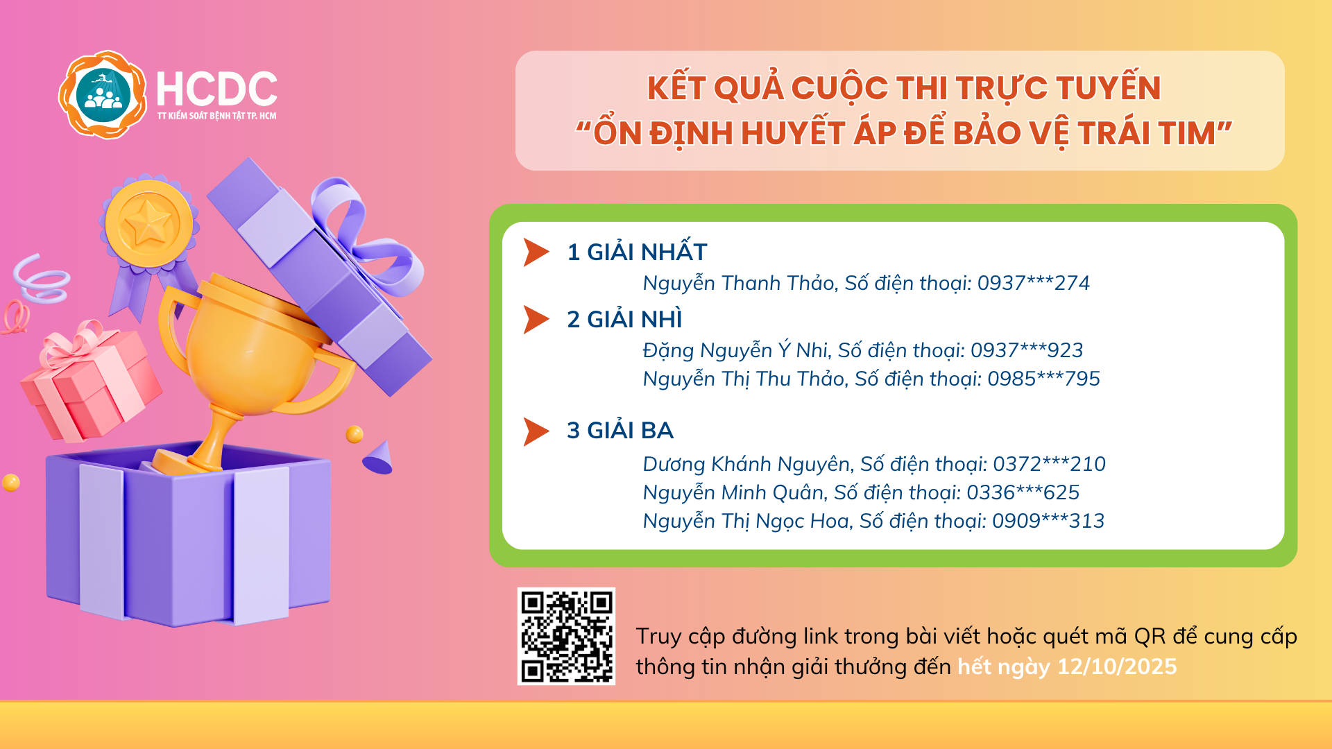 Trung tâm Kiểm soát bệnh tật Thành phố Hồ Chí Minh trân trọng cảm ơn sự tham gia và hưởng ứng tích cực của tất cả các thí sinh. Cuộc thi là hoạt động thiết thực, góp phần nâng cao hiểu biết và thúc đẩy mỗi người chủ động kiểm soát huyết áp, xây dựng lối sống lành mạnh để bảo vệ trái tim khỏe mạnh.