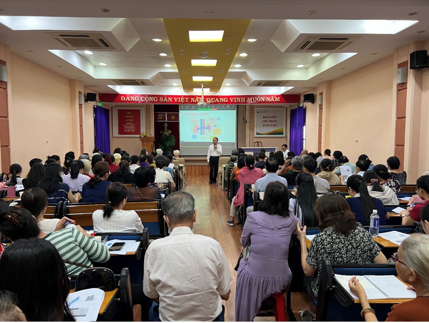 Tại buổi sinh hoạt, các chuyên gia đã trực tiếp giải đáp những thắc mắc về đặc điểm của bệnh thận mạn và các yếu tố nguy cơ phổ biến như đái tháo đường, tăng huyết áp, bệnh tim mạch hay lối sống thiếu lành mạnh.Nội dung chia sẻ nhấn mạnh tầm quan trọng của việc phát hiện sớm và kiểm soát tốt các yếu tố nguy cơ nhằm làm chậm tiến triển của bệnh.