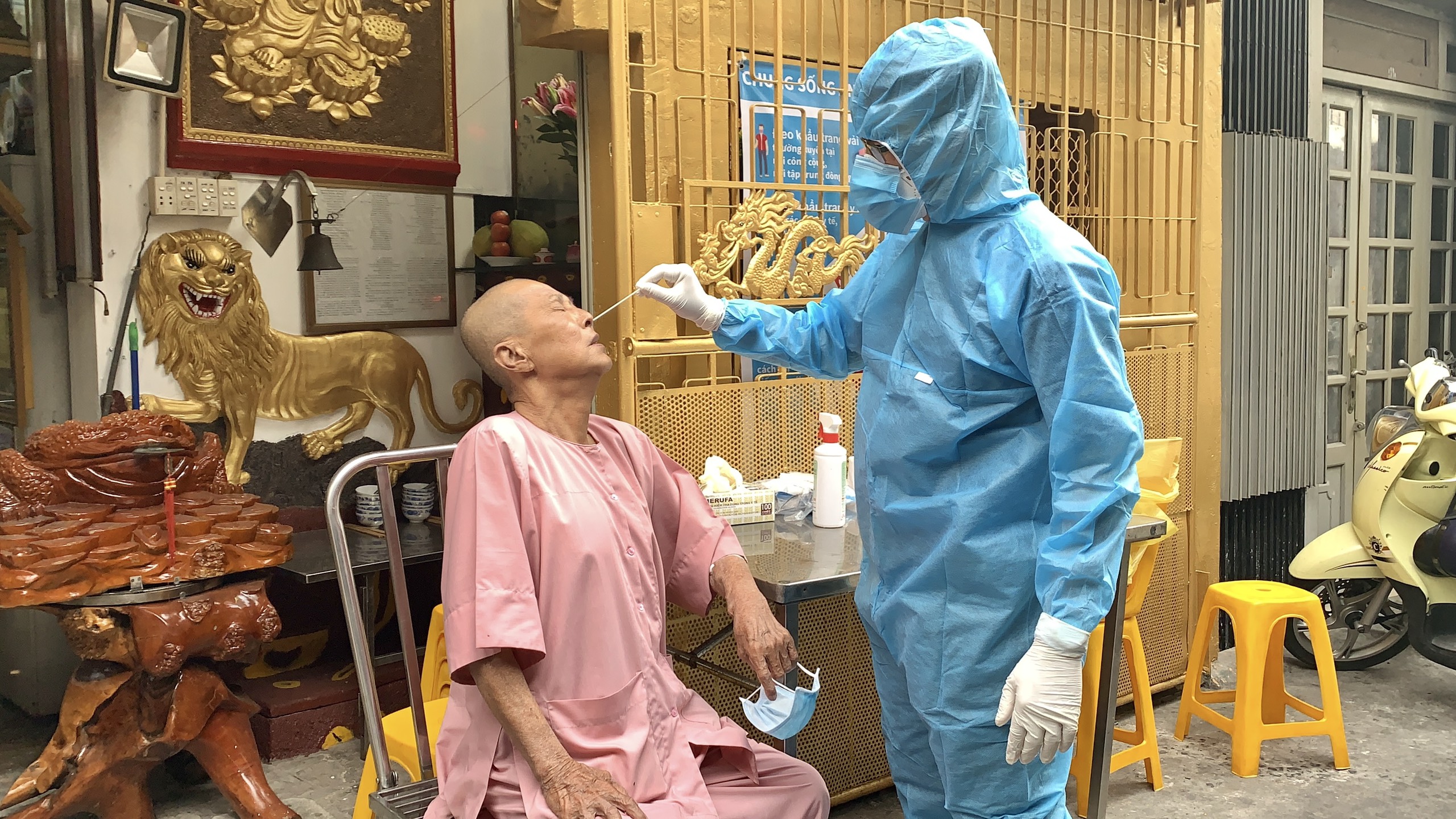 Hình: lấy mẫu xét nghiệm tại chùa Thiên Khánh thuộc phường 7, Quận 6