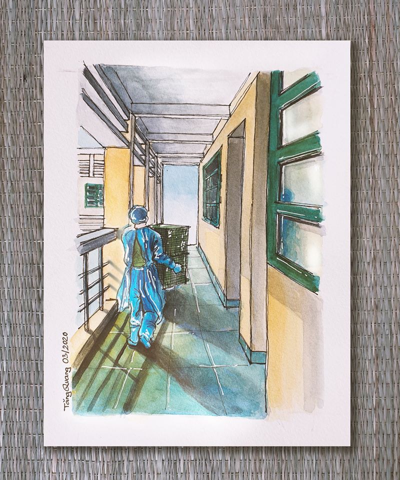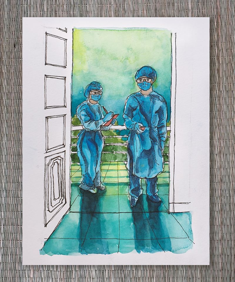 Ảnh: Ảnh từ FB Tăng Quang, đang thực hiện cách ly tập trung tại trường Quân sự Quân khu 7 vẽ tặng cho các chiến sĩ thầm lặng.