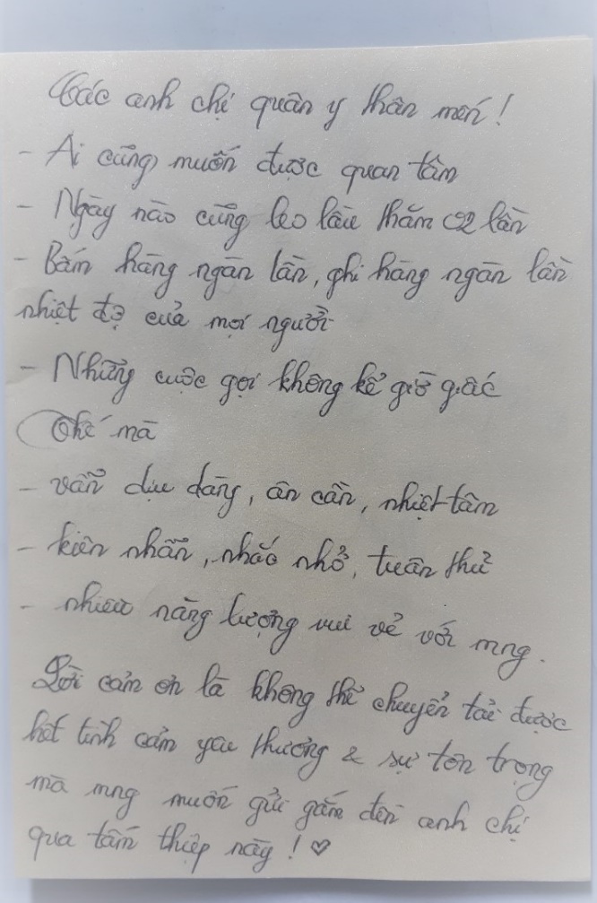 Ảnh: lời tâm tình các bạn cách ly tập trung gửi cho những chiến binh thầm lặng.