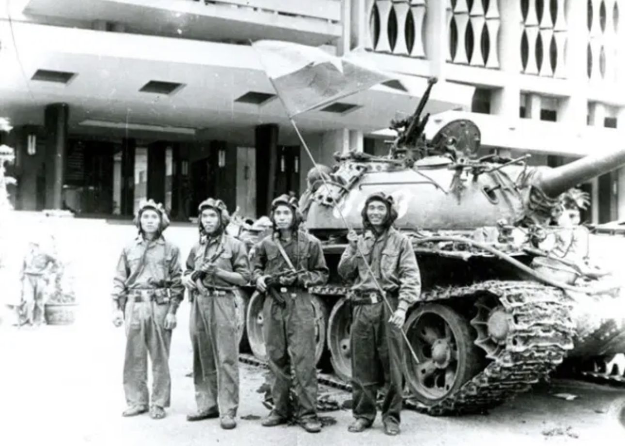 Ảnh: Bốn chiến sĩ Binh đoàn Hương Giang cắm cờ trên nóc Phủ Tổng thống ngụy Sài Gòn ngày 30/4/1975 (Người cầm cờ là chiến sĩ Bùi Quang Thận).