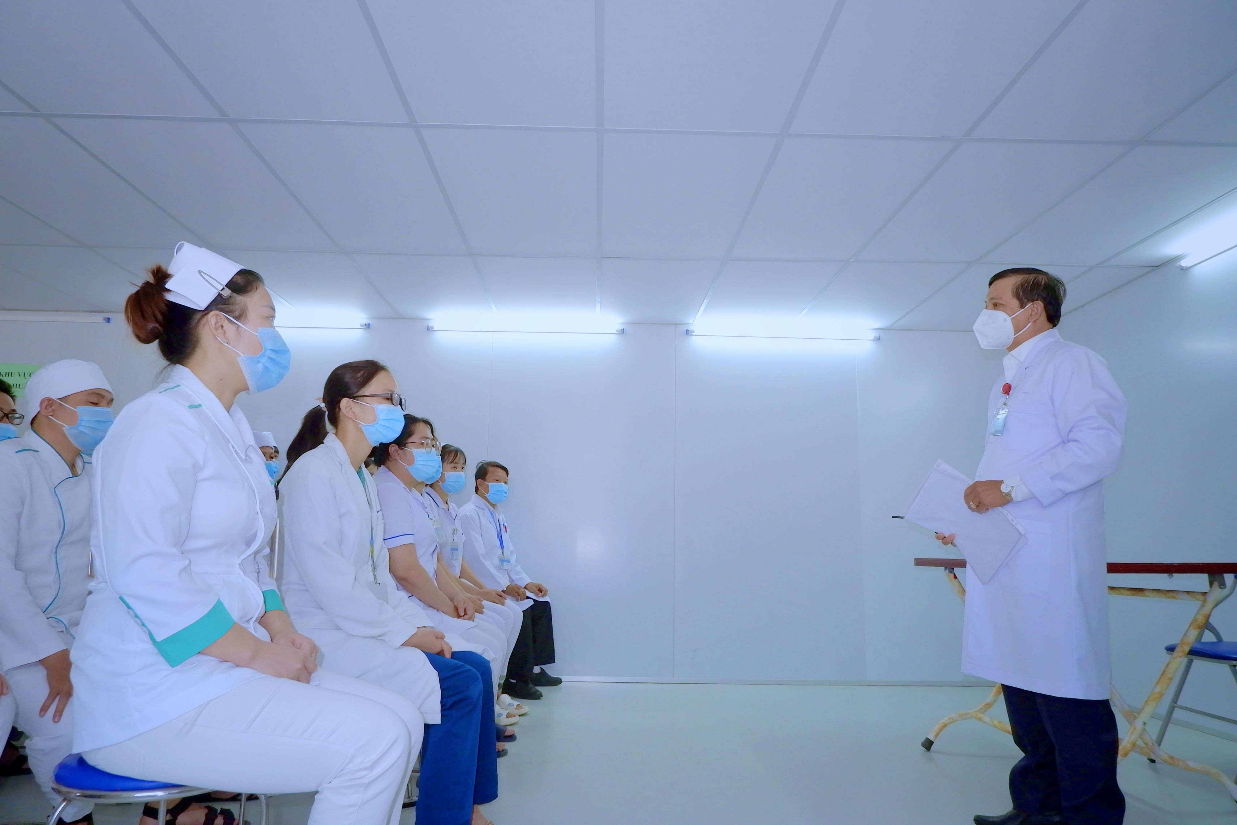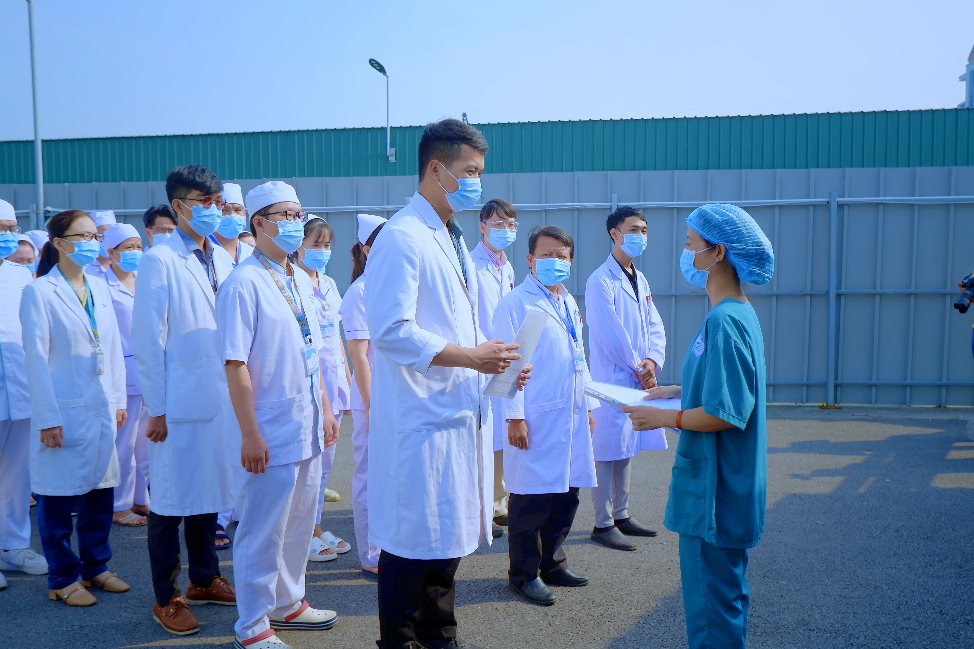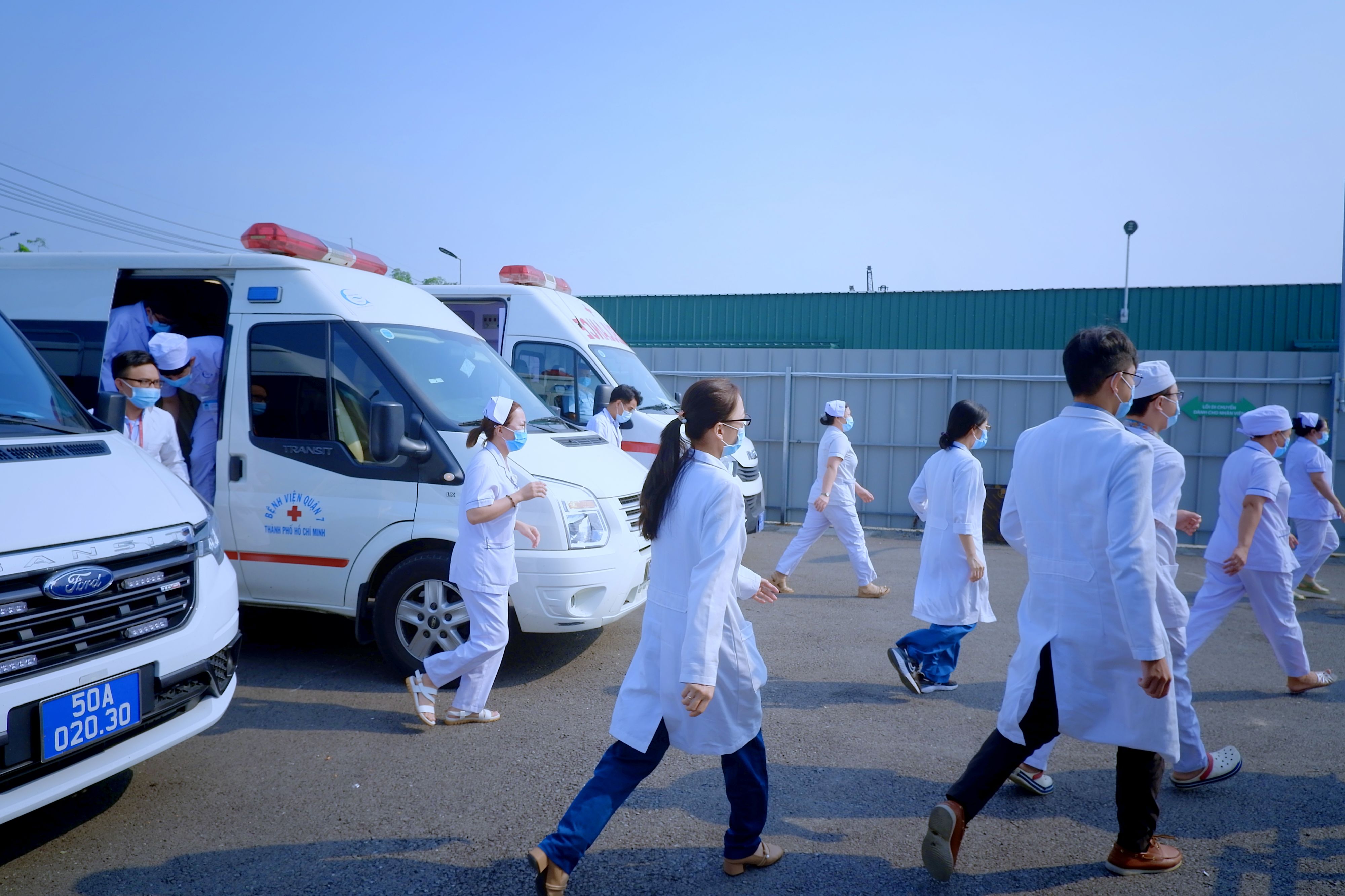 30 nhân viên y tế được điều động từ 3 bệnh viện trực thuộc (Bệnh viện Quận 7, Bệnh viện huyện Bình Chánh và Bệnh viện Nhi đồng Thành phố) di chuyển vào BV dã chiến số 13 từ Cổng 2 và nhanh chóng xuống xe tập hợp để được hướng dẫn đi vào khu Hồi sức tích cực