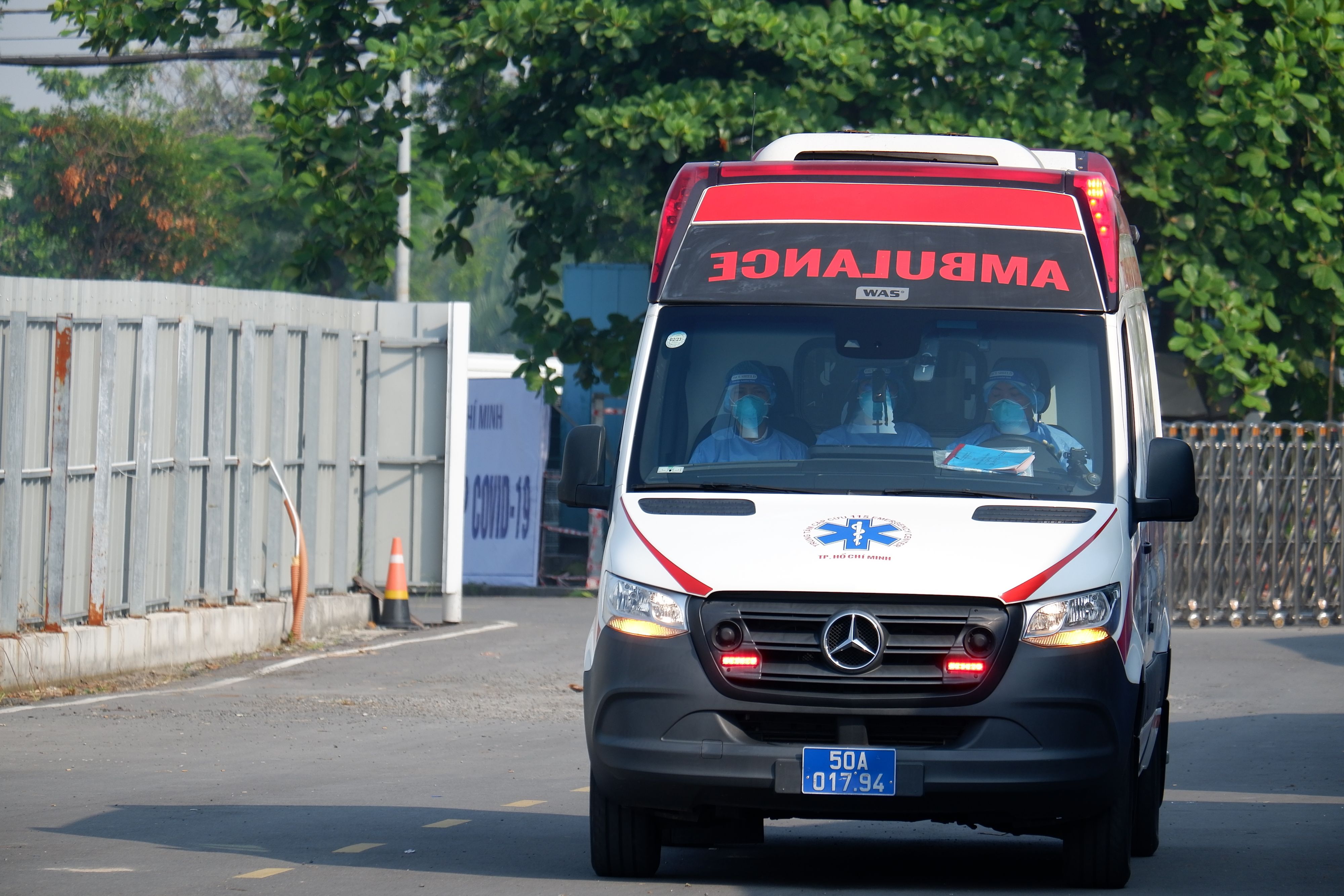 Xe cấp cứu của Trung tâm Cấp cứu 115 vận chuyện người bệnh COVID-19 từ cổng nhận bệnh của bệnh viện Dã chiến số 13 (Cổng 1) di chuyển vào khu Hồi sức tích cực của BV dã chiến số 13