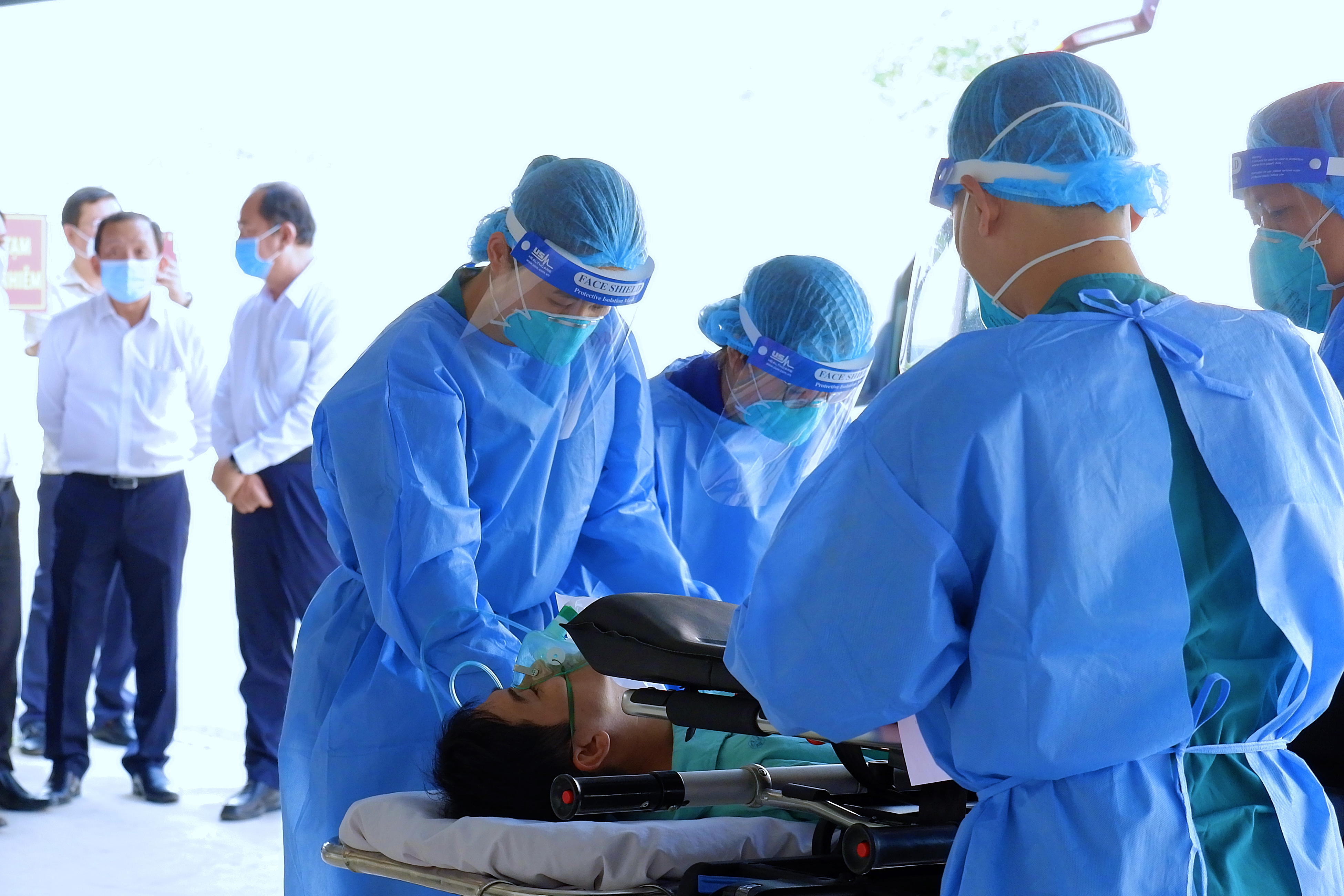 Ê kíp cấp cứu (mặc áo quần phòng hộ và đeo khẩu trang N95) đang di chuyển người bệnh xuống xe và bàn giao cho nhân viên y tế tại khu Hồi sức tích cực của bệnh viện dã chiến số 13