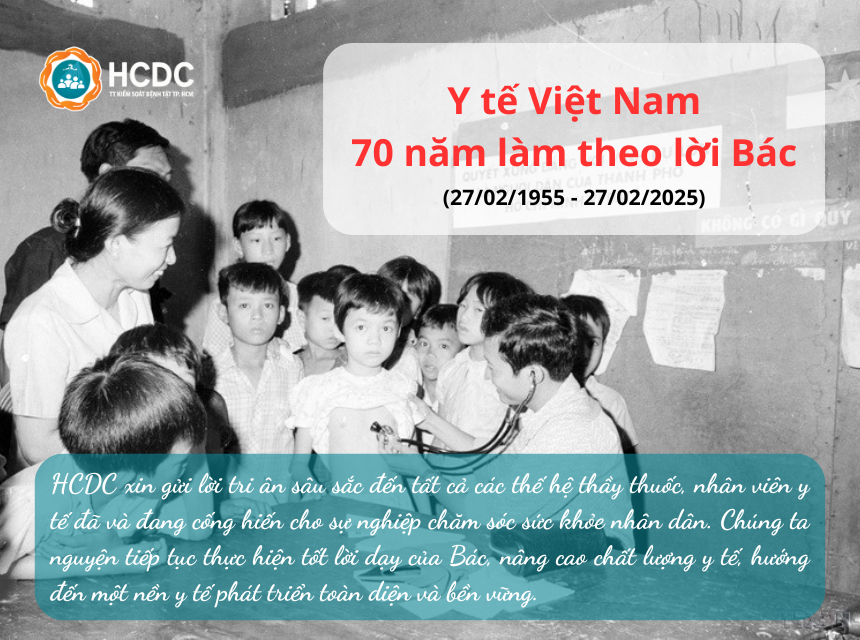 Nhân kỷ niệm 70 năm Ngày Thầy thuốc Việt Nam, Trung tâm Kiểm soát bệnh tật Thành phố (HCDC) xin gửi lời tri ân sâu sắc đến tất cả các thế hệ thầy thuốc, nhân viên y tế đã và đang cống hiến cho sự nghiệp chăm sóc sức khỏe nhân dân. Chúng ta nguyện tiếp tục thực hiện tốt lời dạy của Bác, nâng cao chất lượng y tế, hướng đến một nền y tế phát triển toàn diện và bền vững.