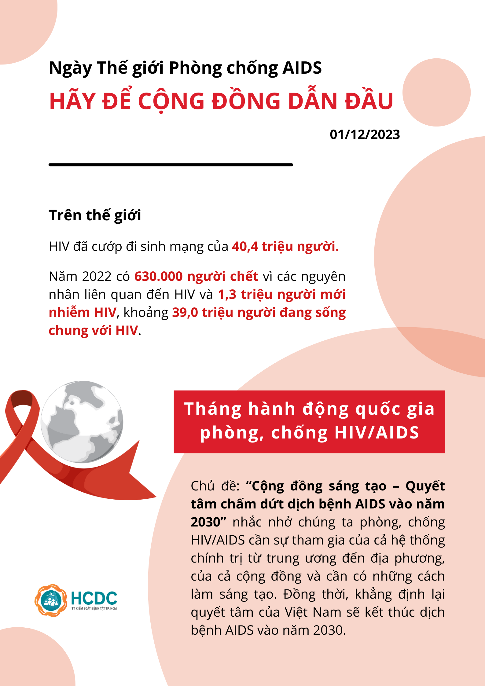 Bên cạnh đó, tháng 12 là tháng hành động quốc gia phòng, chống HIV/AIDS. Năm 2023, Việt Nam tập trung vào chủ đề: “Cộng đồng sáng tạo – Quyết tâm chấm dứt dịch bệnh AIDS vào năm 2030”. Việc lựa chọn chủ đề này nhằm nhắc nhở chúng ta rằng, phòng, chống HIV/AIDS cần sự tham gia của cả hệ thống chính trị từ trung ương đến địa phương, của cả cộng đồng và cần có những cách làm sáng tạo vì sự hiểu biết của chúng ta về HIV/AIDS đã có nhiều thay đổi, tình hình dịch HIV cũng đã có những thay đổi, cách tiếp cận cũng như can thiệp liên quan đến dự phòng, điều trị HIV/AIDS cũng đã thay đổi. Chúng ta có nhiều công cụ có hiệu quả hơn để can thiệp cũng như kiểm soát đại dịch này. Chủ đề này cũng muốn khẳng định lại quyết tâm của Việt Nam sẽ kết thúc dịch bệnh AIDS vào năm 2030.
