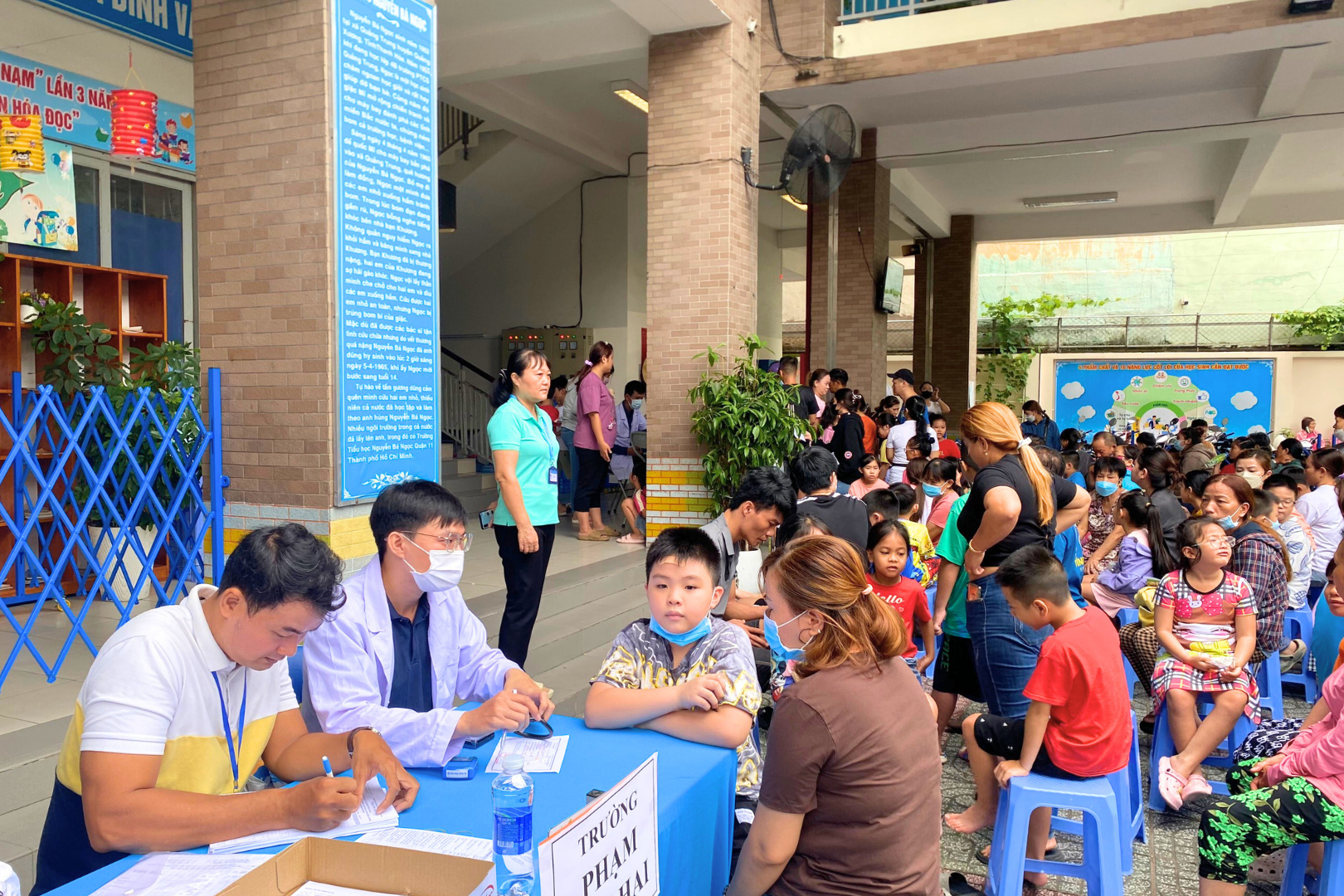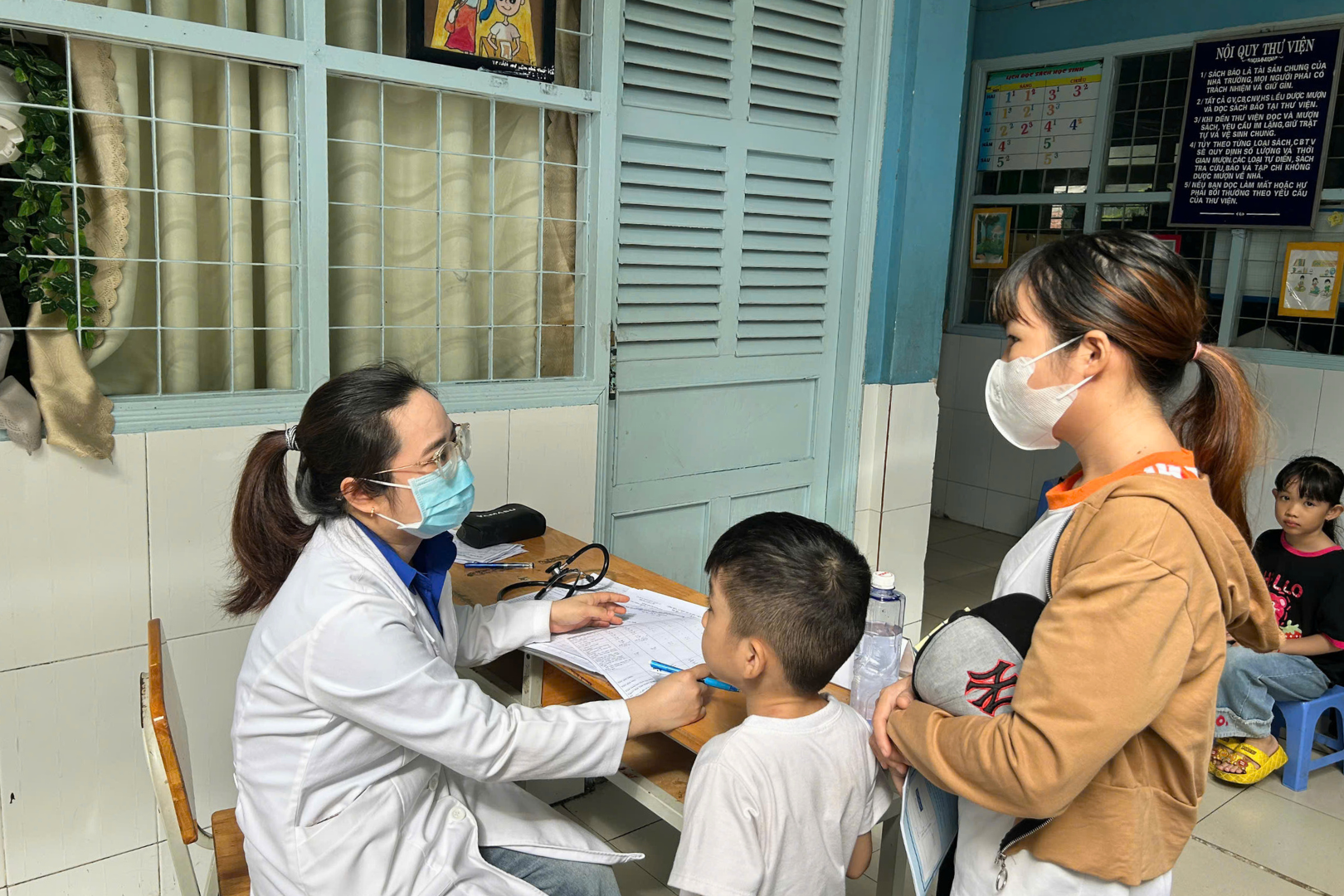 Bác sĩ kiểm tra sức khỏe cho học sinh trước khi tiêm, đảm bảo trẻ đủ điều kiện tham gia tiêm chủng an toàn. Hình ảnh tại một điểm tiêm ở quận 7.