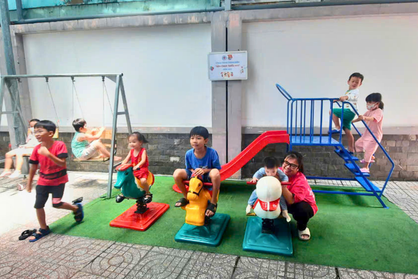 Các học sinh chờ đến lượt tiêm tại điểm tiêm không hề tỏ ra lo lắng, mà còn vui vẻ chơi đùa cùng bạn bè. Đây là Điểm tiêm định kỳ thứ bảy hằng tuần dành cho TCMR và chiến dịch sởi tại Trung tâm Y tế quận Tân Phú. Khu vui chơi được bố trí trong khu vực theo dõi sau tiêm, giúp trẻ thoải mái và giảm căng thẳng trước khi tiêm chủng.
