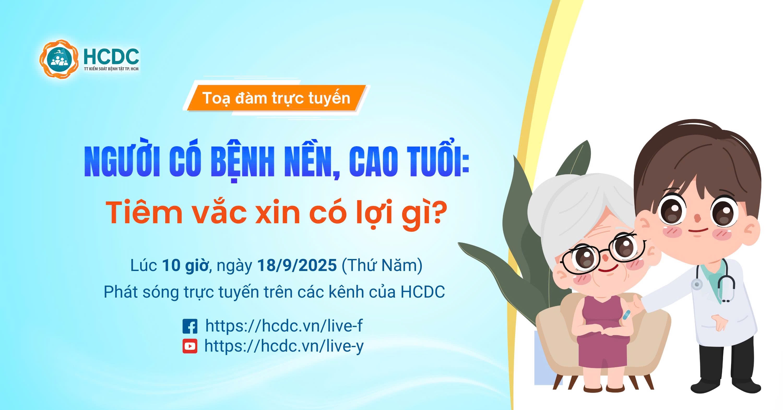 Để giải đáp những thắc mắc này, Trung tâm Kiểm soát bệnh tật Thành phố Hồ Chí Minh (HCDC) tổ chức tọa đàm trực tuyến với chủ đề “Người có bệnh nền, cao tuổi: Tiêm vắc xin có lợi gì?”. Buổi tọa đàm không chỉ cung cấp thông tin chuyên môn mà còn gửi gắm thông điệp mạnh mẽ “Phòng bệnh hơn chữa bệnh”. Chủ động tiêm vắc xin chính là cách để mỗi cá nhân và mỗi gia đình bảo vệ sức khỏe, giảm gánh nặng bệnh tật và sống an toàn hơn.