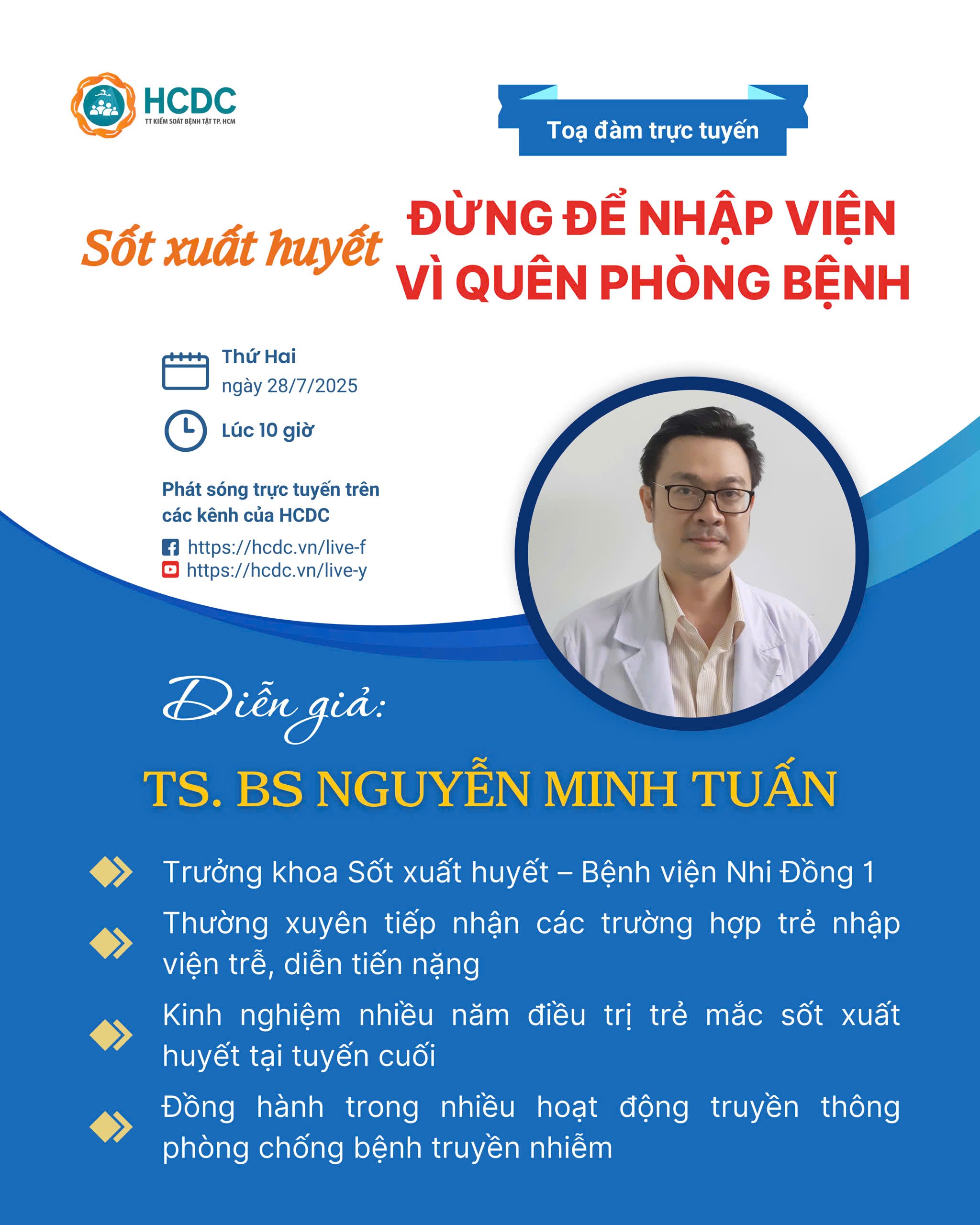 Tọa đàm trực tuyến “Sốt xuất huyết: Đừng để nhập viện - Vì quên phòng bệnh” được phát sóng vào lúc 10g00 ngày 28/7/2025, trên Fanpage (https://hcdc.vn/live-f) và Youtube (https://hcdc.vn/live-y) của Trung tâm Kiểm soát bệnh tật Thành phố. Đây là cơ hội tuyệt vời để phụ huynh trang bị những kiến thức hữu ích từ một trong những chuyên gia hàng đầu về sốt xuất huyết ở trẻ em.