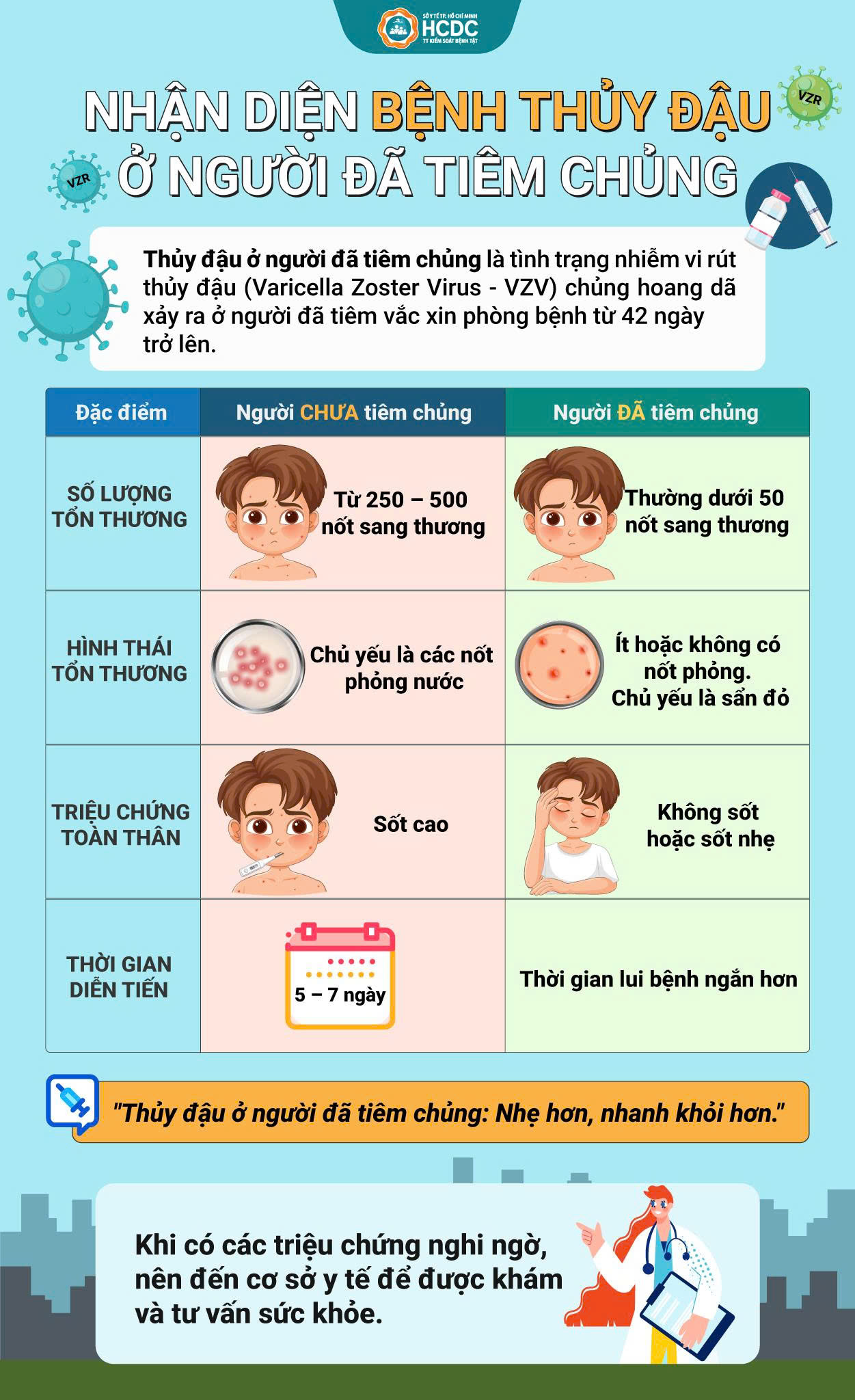 Thủy đậu ở người đã tiêm chủng là tình trạng nhiễm vi rút thủy đậu chủng hoang dã xảy ra ở những người đã tiêm vắc xin phòng bệnh từ 42 ngày trở lên. Việc chẩn đoán lâm sàng thường gặp khó khăn do các biểu hiện của thể bệnh này dễ nhầm lẫn với các tình trạng viêm da khác. Hãy cùng HCDC tìm hiểu việc nhận diện bệnh thủy đậu ở người đã tiêm chủng qua infographic dưới đây: