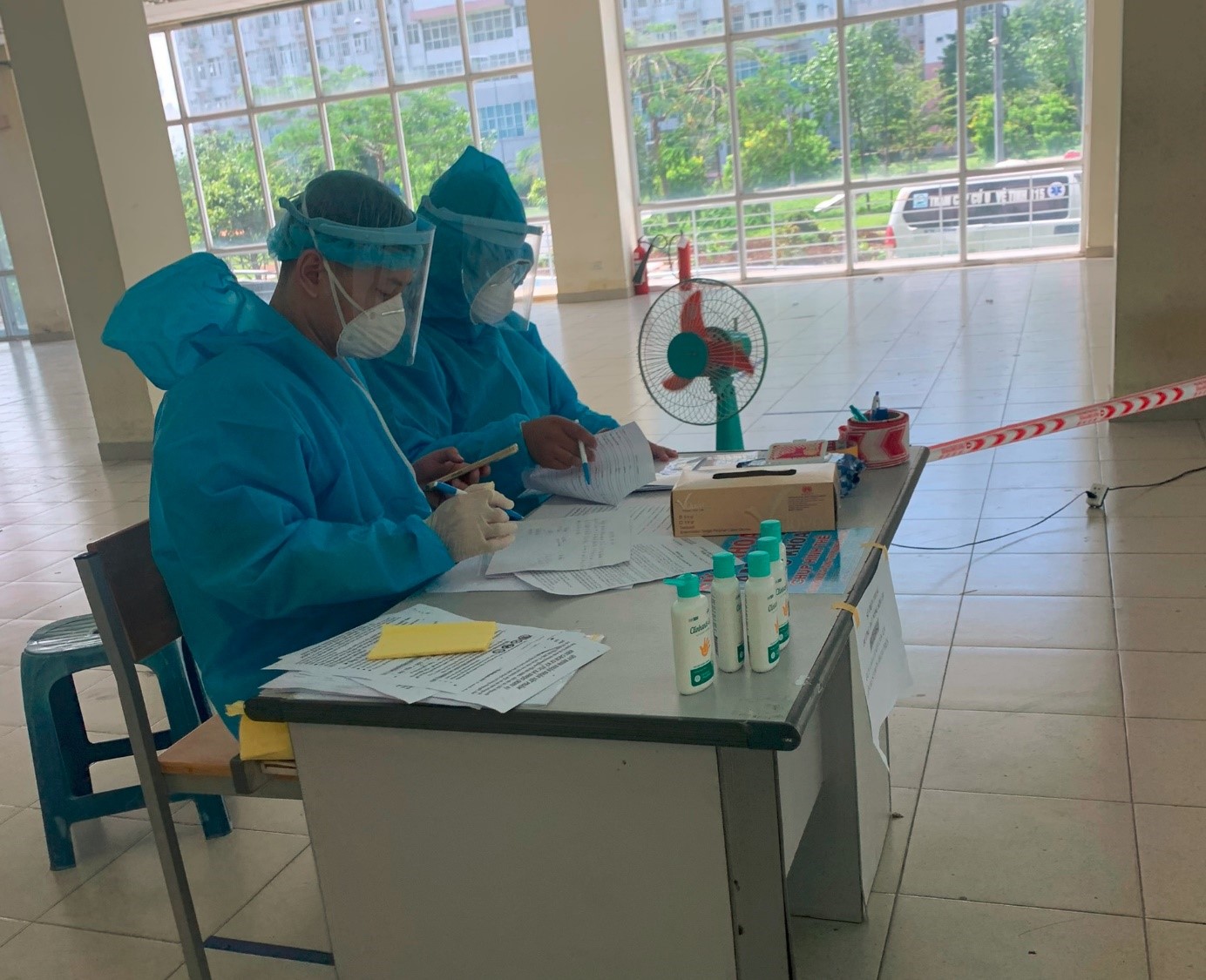 Ảnh: Nhân viên y tế đang thực hiện công tác tiếp nhận thông tin người đến cách ly.