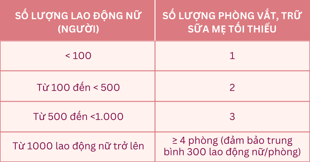 Theo Quyết định số 5175/QĐ-BYT ngày 09 tháng 11 năm 2021 của Bộ Y Tế, số lượng phòng vắt, trữ sữa tối thiểu tại nơi làm việc phải đáp ứng theo quy định sau: