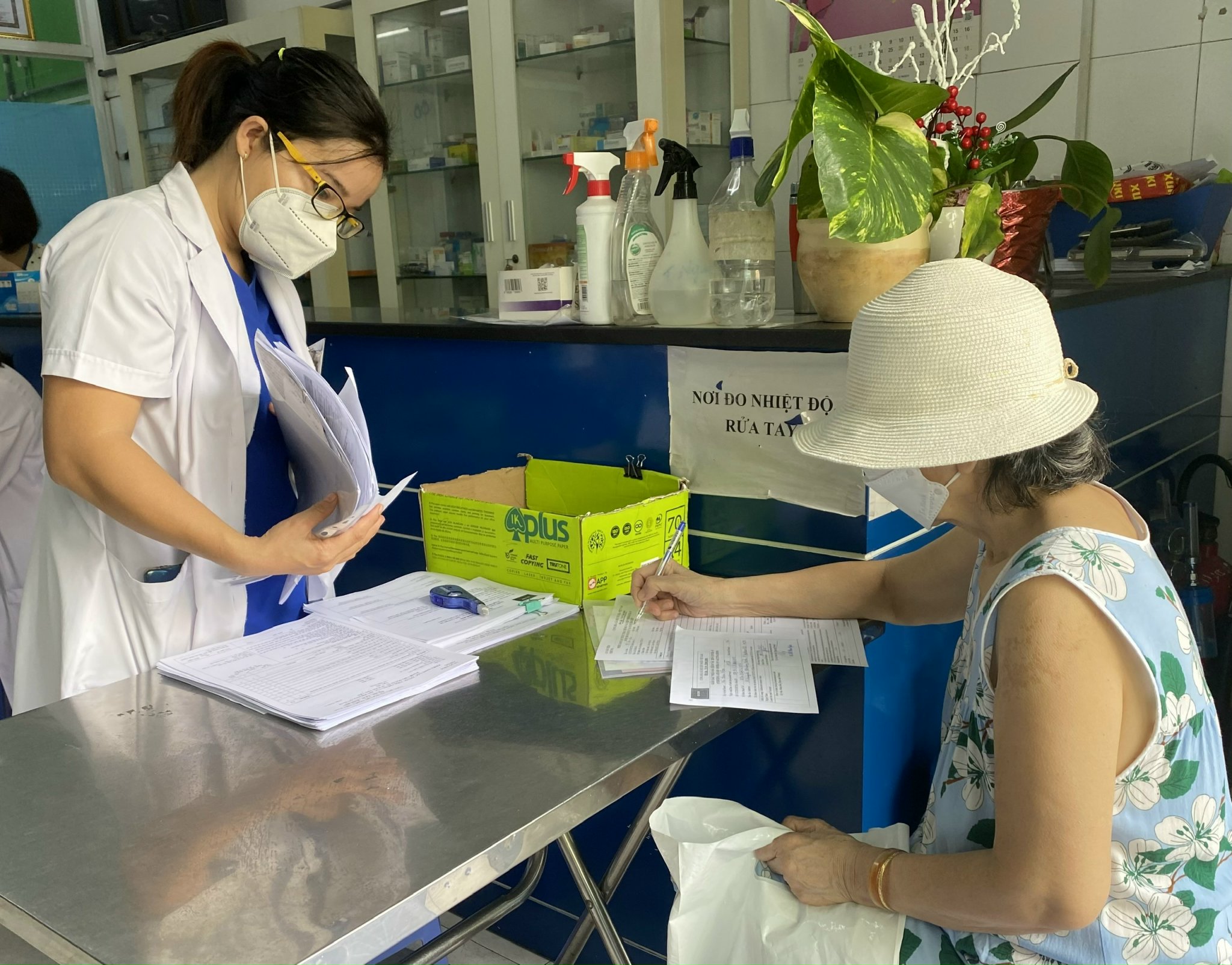 Ảnh: Người dân ký và nhận giấy xác nhận sau tiêm chủng vắc xin phòng COVID-19