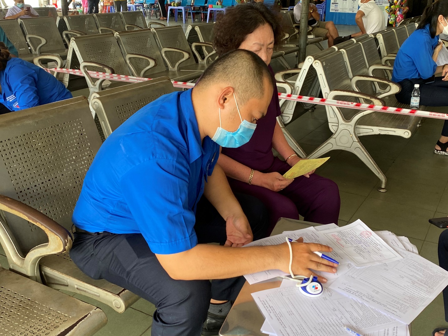 Ảnh: Tình nguyện viên hết mình hỗ trợ người dân điền các thông tin cơ bản trước tiêm