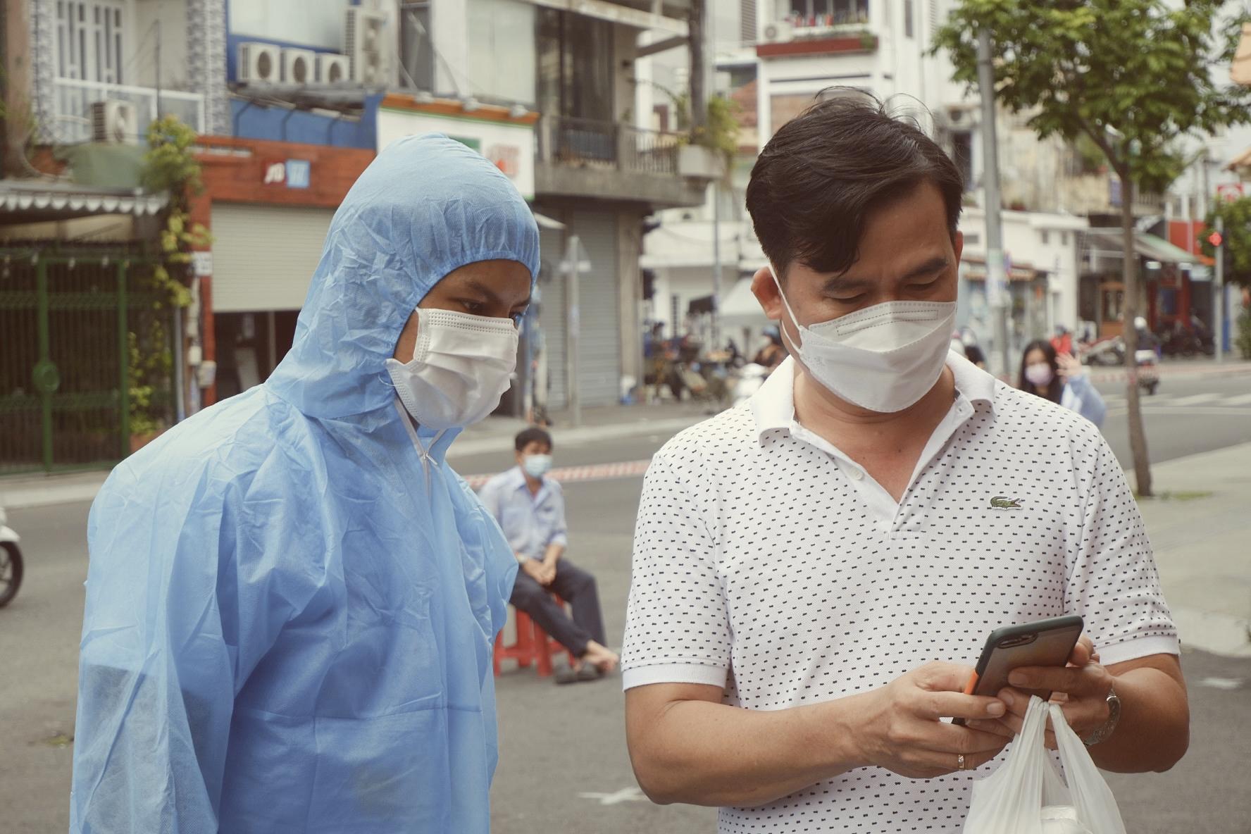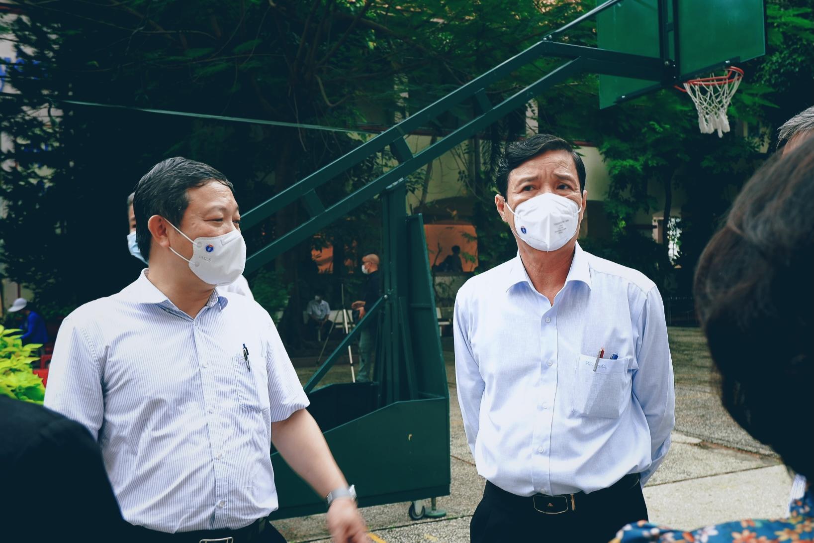 Ông Dương Anh Đức, Phó Chủ tịch UBND thành phố (bên trái) và ông Nguyễn Hữu Hưng, Phó Giám đốc Sở Y tế (bên phải) đến chỉ đạo trực tiếp tại điểm tiêm.
