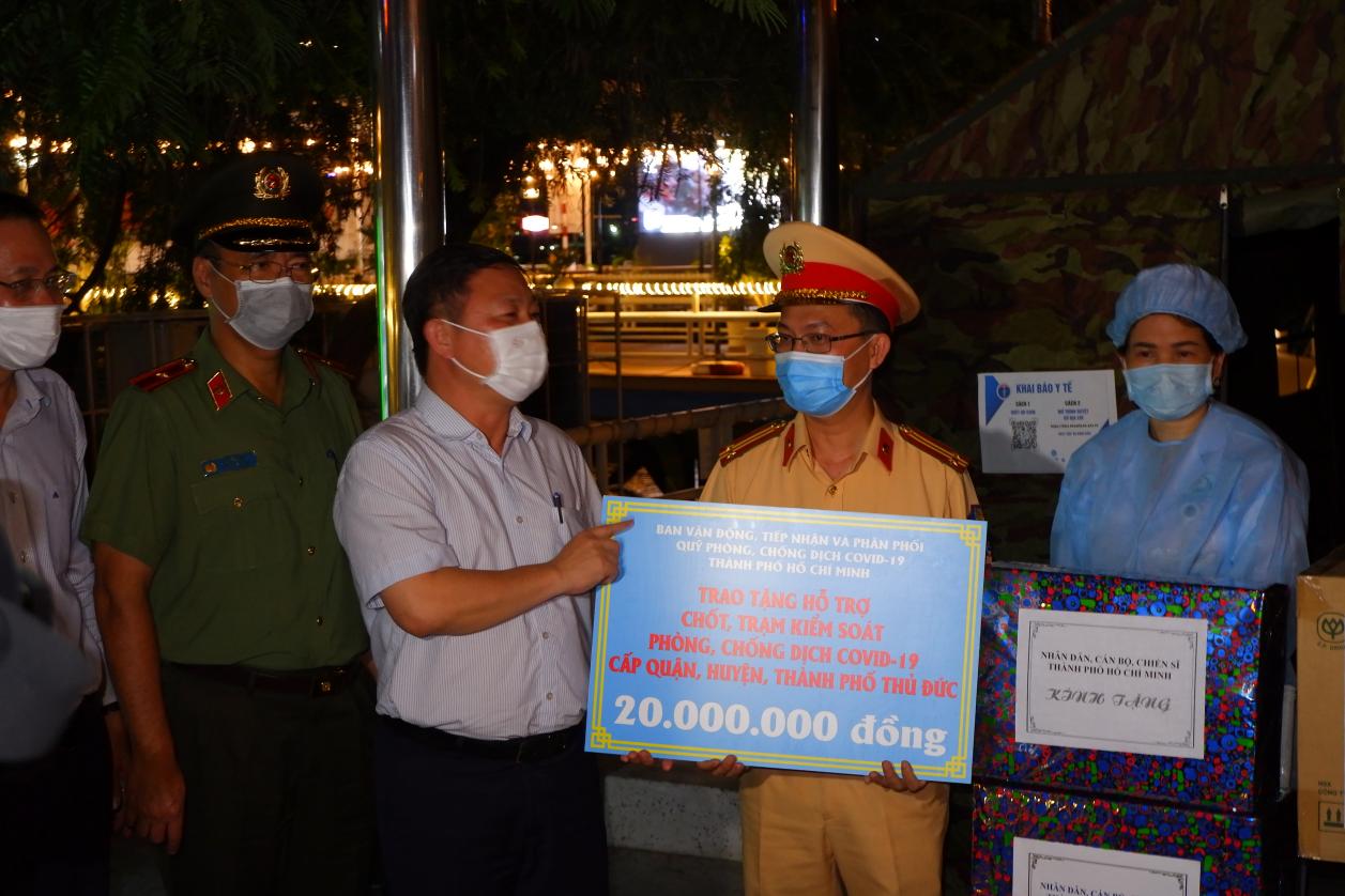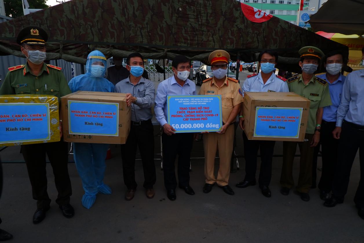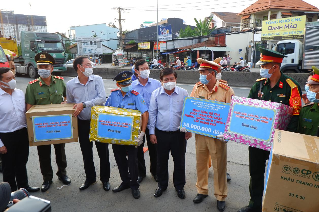 Tại mỗi điểm, lãnh đạo TP Hồ Chí Minh cũng đã động viên lực lượng tại các chốt kiểm dịch tiếp tục quyết tâm, đồng hành cùng Thành phố vượt qua giai đoạn khó khăn của dịch Covid-19. Tại mỗi chốt, đoàn cũng trao hỗ trợ 50 triệu đồng và phần quà trị giá hai triệu đồng để động viên lực lượng hoàn thành tốt nhiệm vụ kiểm soát dịch tại cửa ngõ TP Hồ Chí Minh.