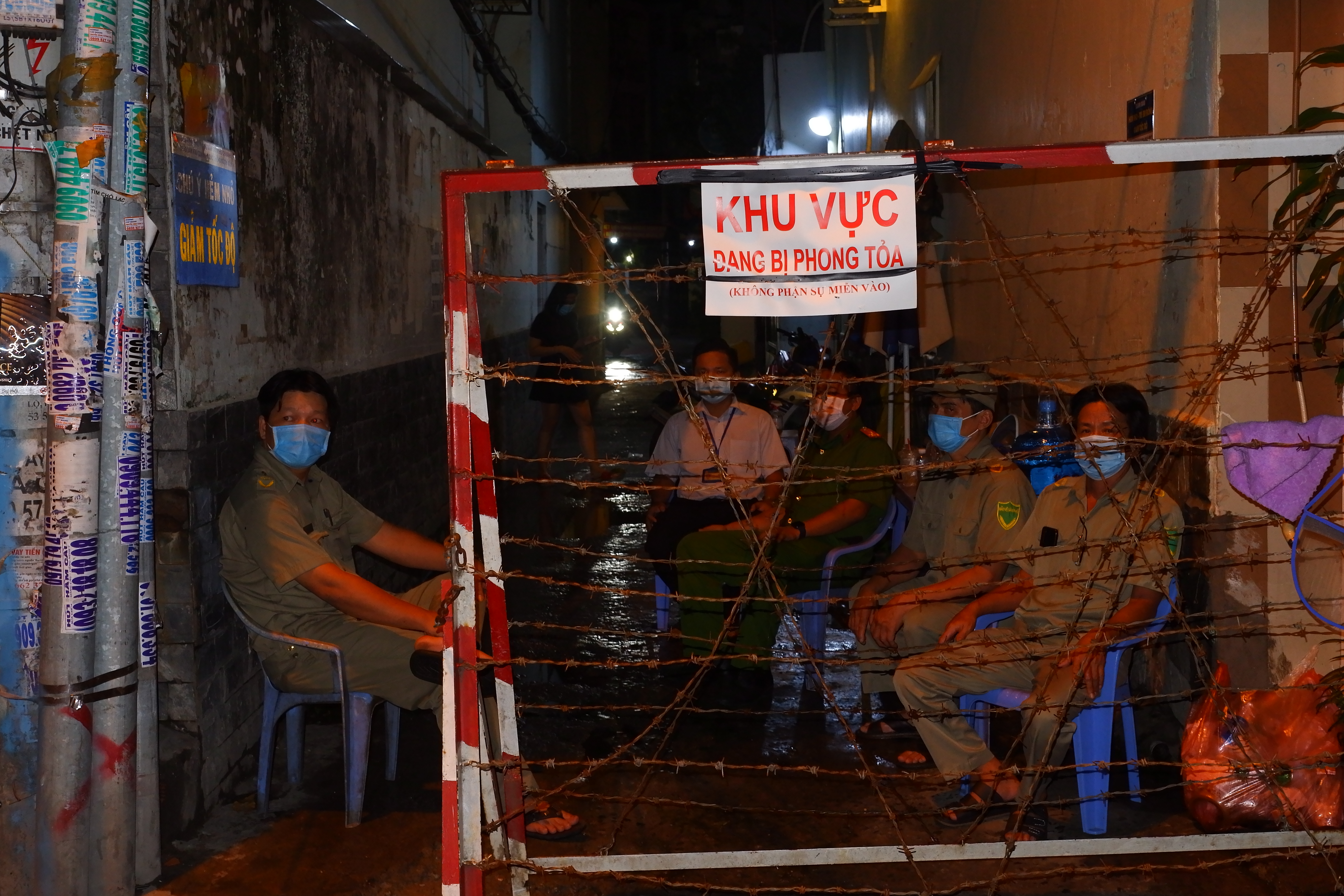 23g45 khuya ngày 2/6: hình ảnh lực lượng chức năng trực chốt phong tỏa các con hẻm liên thông tại phường 15, quận Bình Thạnh