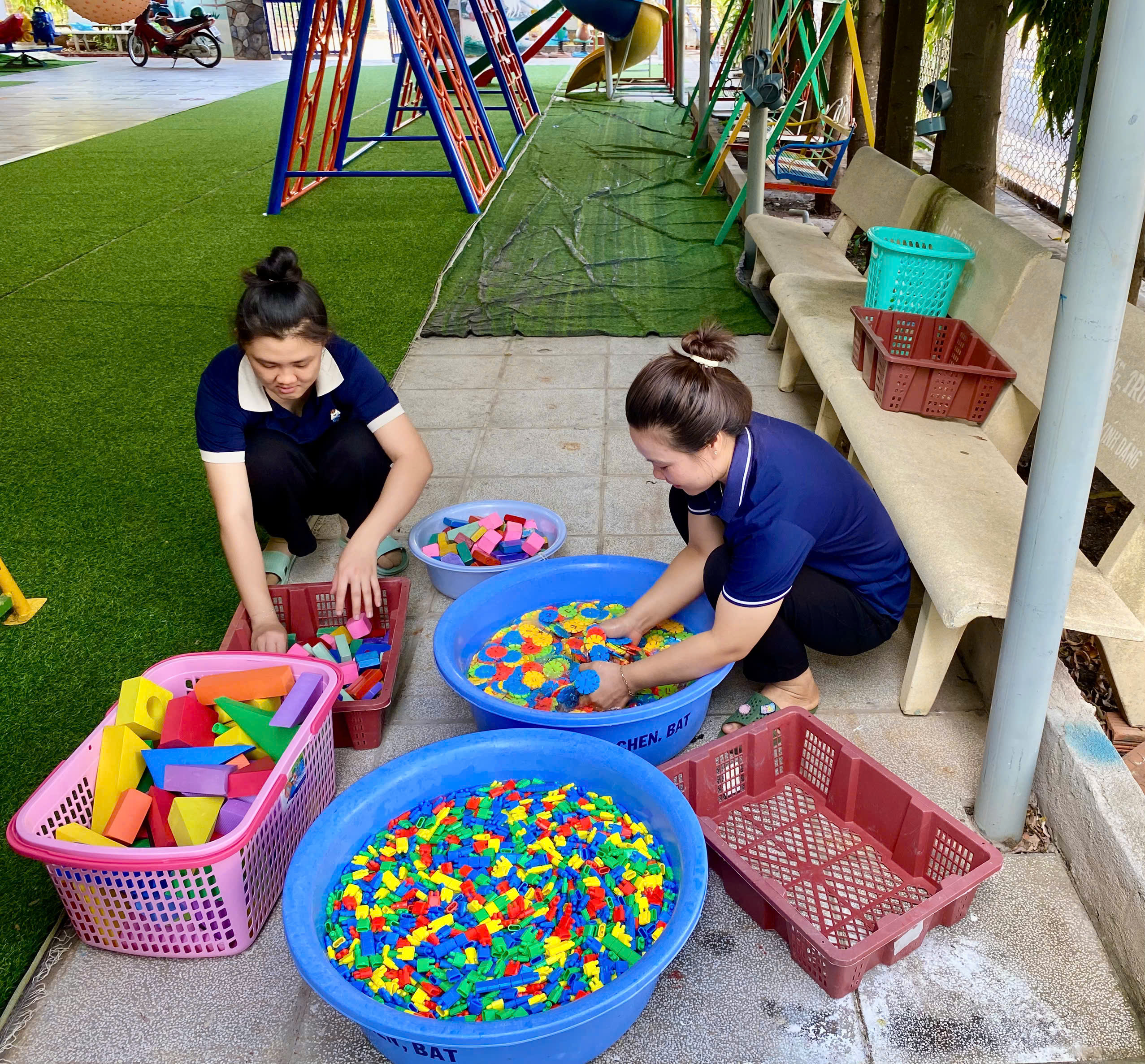 Ảnh: Giáo viên trường Mầm non Long Tâm, phường Bà Rịa thực hiện vệ sinh sạch sẽ đồ chơi cho trẻ.