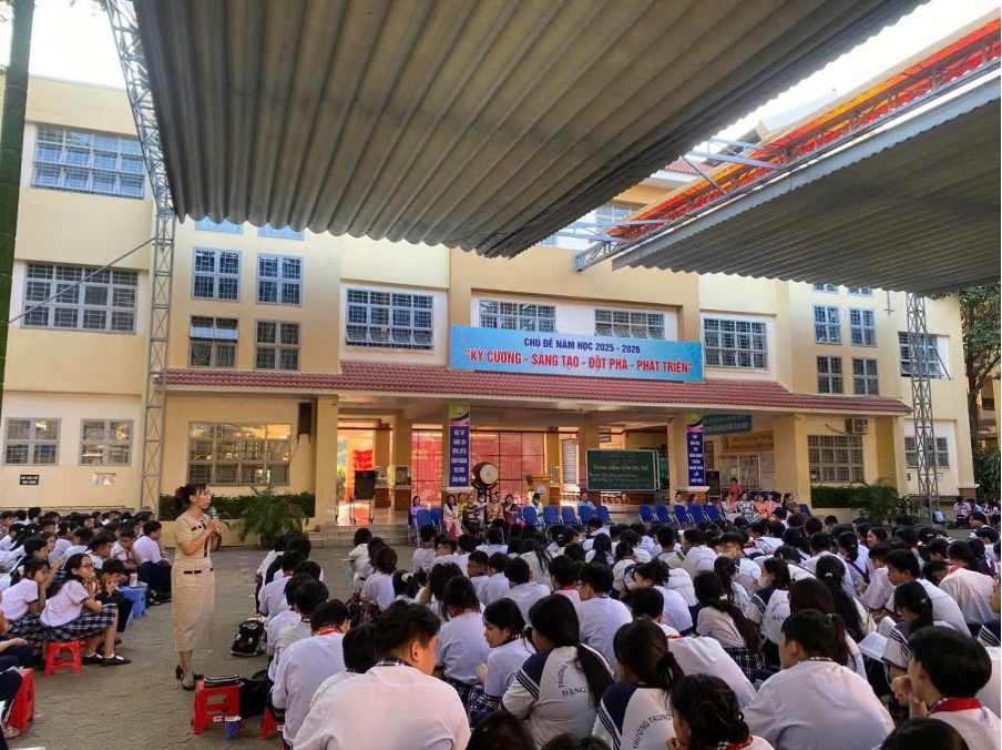 Ảnh: Quang cảnh buổi truyền thông giáo dục sức khỏe cho học sinh trường THCS Đặng Tấn Tài
