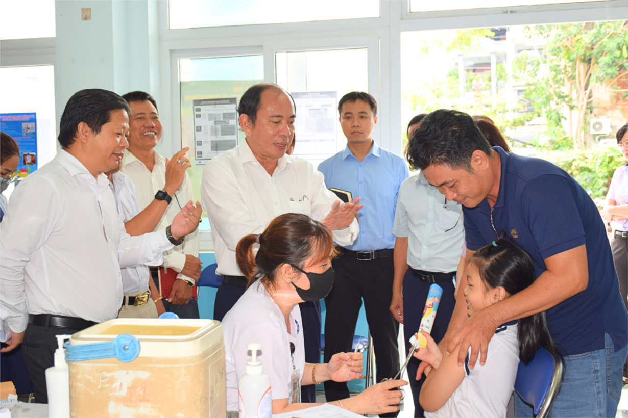 PGS TS BS Tăng Chí Thượng, Giám đốc Sở Y tế kiểm tra thực tế điểm tiêm chủng vắc xin sởi tại Trường tiểu học Nguyễn Trực (17/9/2024)