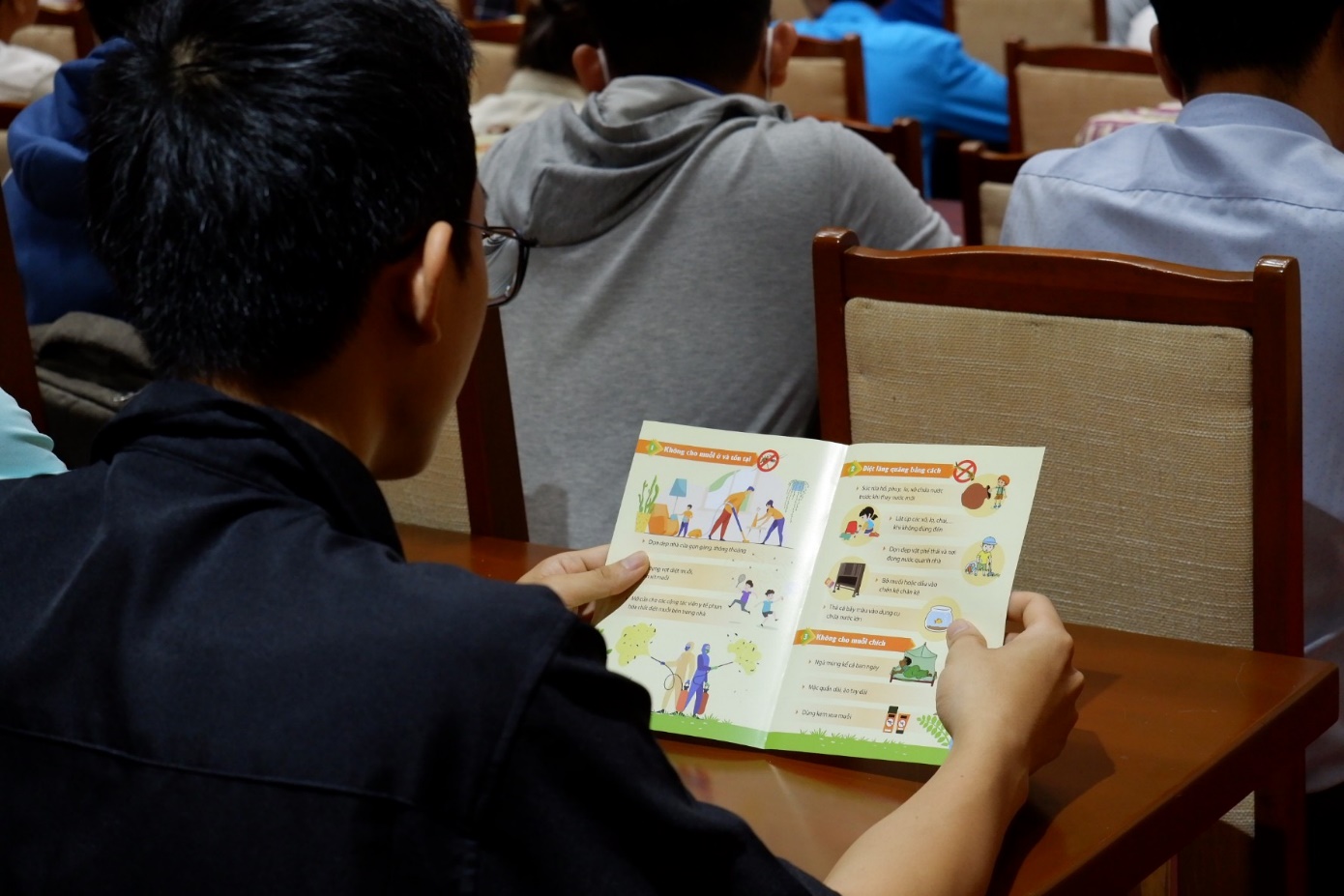 Ảnh: Người dân được phát tờ rơi truyền thông khi đến tham dự lễ phát động.