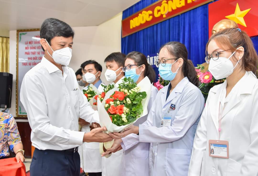 Ông Nguyễn Bá Thành, Chủ tịch Ủy ban nhân dân quận Tân Bình tặng hoa cho các bác sĩ trẻ (Ảnh: Tân Bình trong trái tim tôi)
