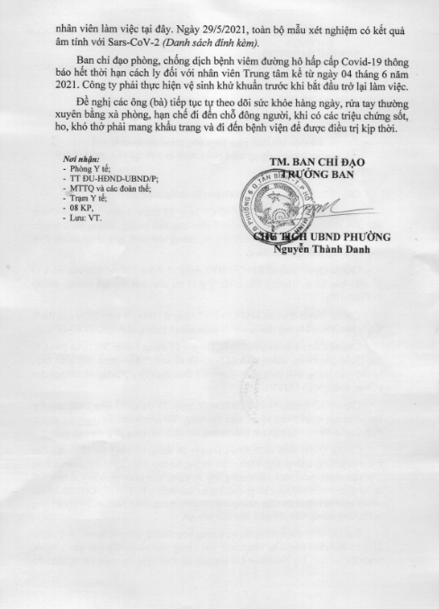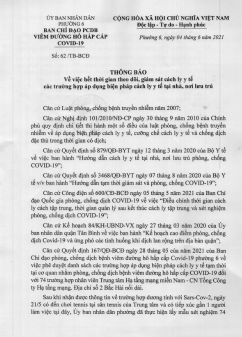Vào 16 giờ 30 ngày 04/06/2021, Ban chỉ đạo phòng chống dịch bệnh viêm đường hô hấp cấp COVID-19 phường 6, quận Tân Bình đã ra thông báo hết thời gian phong tỏa tại Trung tâm Hạ tầng mạng miền Nam - CN Tổng Công ty Hạ tầng mạng từ 00 giờ ngày 05/6/2021.