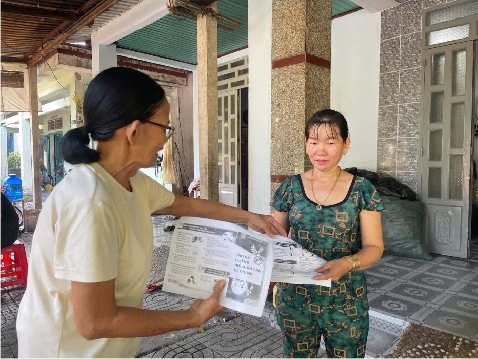 Cộng tác viên sức khỏe cộng đồng huyện Củ Chi phát tờ rơi truyền thông phòng chống Sốt xuất huyết và Chikungunya đến người dân.