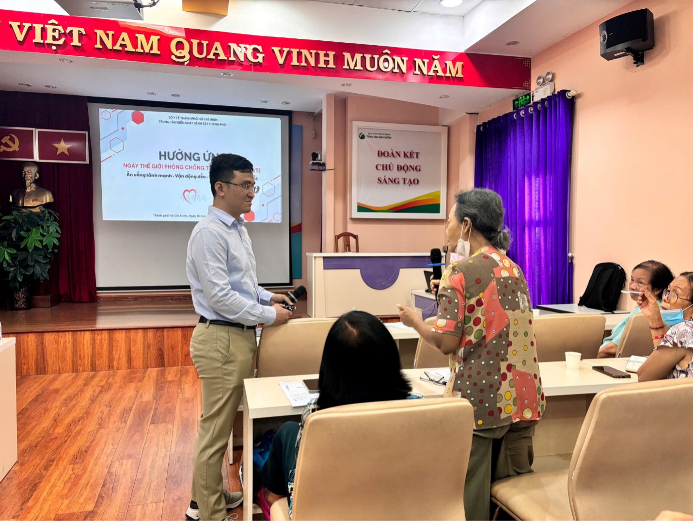 Sáng 15/5, Câu lạc bộ Dinh dưỡng – Bệnh không lây (thuộc Khoa Dinh dưỡng – Bệnh không lây, HCDC) đã tổ chức buổi sinh hoạt chuyên đề với chủ đề “Ăn uống lành mạnh – Vận động đều – Kiểm soát huyết áp tốt”, nhằm nâng cao nhận thức cộng đồng về bệnh tăng huyết áp – một trong những nguyên nhân hàng đầu gây đột quỵ, suy tim, suy thận mạn.