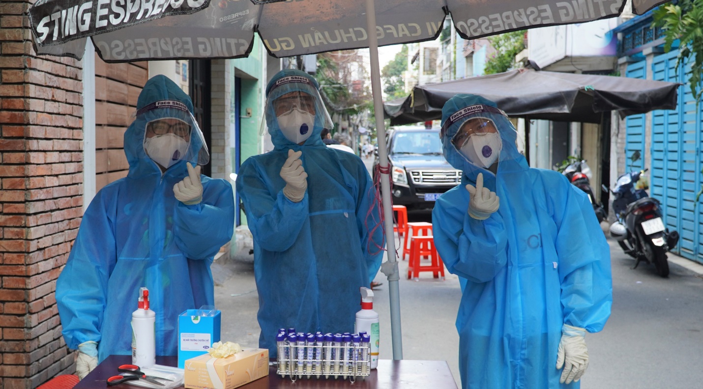 Khoảnh khắc tươi vui của các bạn sinh viên hỗ trợ lấy mẫu tại Quận 3 trong đó có chàng sinh viên tình nguyện Hữu Đạt (ở giữa).