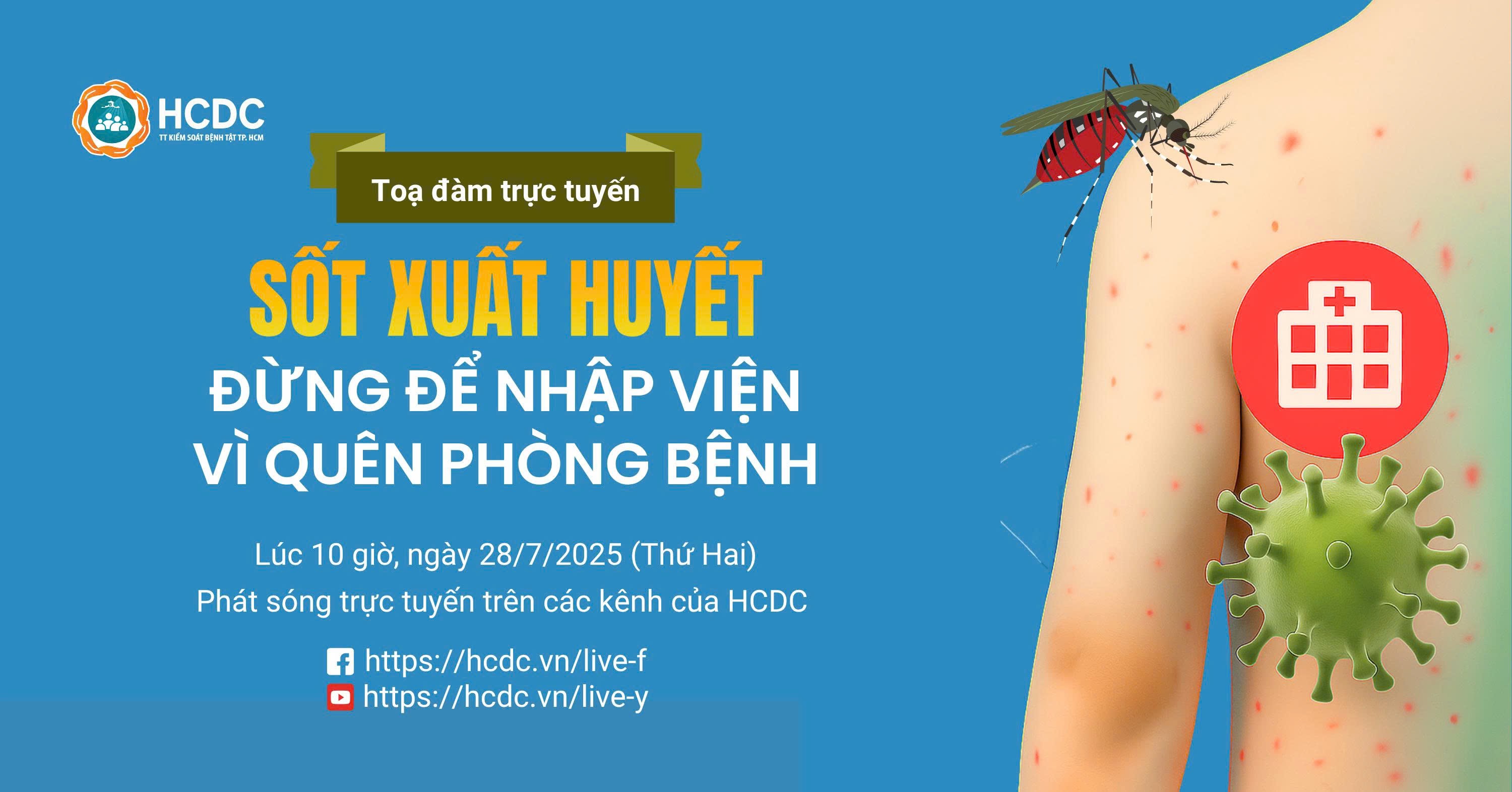 Hãy đón xem tọa đàm trực tuyến “Sốt xuất huyết: Đừng để nhập viện - Vì quên phòng bệnh” để hiểu rõ hơn về những gánh nặng do bệnh sốt xuất huyết gây ra và vai trò quan trọng của mỗi người trong việc chủ động thực hiện các biện pháp phòng bệnh. Chương trình sẽ được phát sóng vào lúc 10g00 ngày 28/7/2025 trên kênh Fanpage và Youtube của Trung tâm Kiểm soát bệnh tật Thành phố.