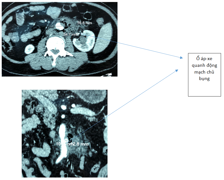 Người bệnh được chụp CT-scan có bơm cản quang. Kết quả hình ảnh cho thấy động mạch chủ bụng bị thủng 1 lỗ đường kính khoảng 2cm, tạo thành túi phình giả quanh động mạch chủ kích thước lớn, đường kính 6,5cm kéo dài 8,8cm. Các bác sĩ chẩn đoán đây là một trường hợp nhiễm trùng sau phúc mạc, ổ nhiễm trùng ăn thủng động mạch chủ bụng dưới thận tạo thành túi phình giả, nguy cơ vỡ khiến người bệnh tử vong bất cứ lúc nào. Bệnh nhân cần được gấp rút phẫu thuật thay đoạn động mạch chủ bị thủng do nhiễm trùng.