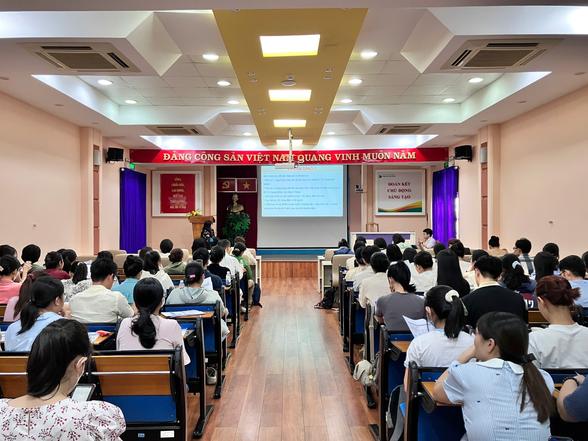 Trong phần trình bày chính, BS.CKII Trần Thị Kim Chi – Trưởng khoa Dinh dưỡng tiết chế, Bệnh viện Nhân dân Gia Định – trình bày các ca lâm sàng thực tế, từ bệnh thận cấp, thận mạn kèm nhiễm khuẩn huyết, đái tháo đường đến suy dinh dưỡng nặng. Bác sĩ nhấn mạnh tầm quan trọng của việc đánh giá sớm tình trạng dinh dưỡng, phòng ngừa hội chứng tái nuôi ăn và cá thể hóa chế độ dinh dưỡng cho từng bệnh nhân.