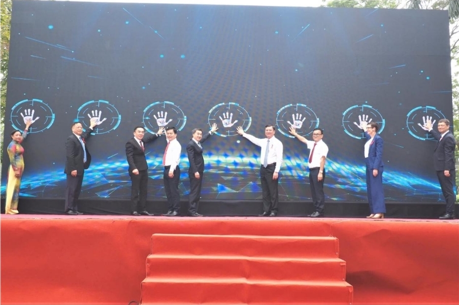 Ảnh: Lãnh đạo thực hiện nghi thức ấn nút hưởng ứng, cam kết đồng hành chấm dứt đại dịch AIDS tại Việt Nam vào năm 2030