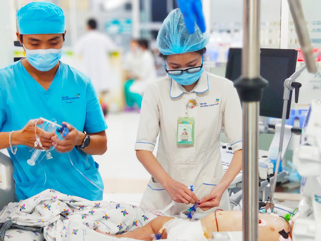 Ngay sau nhập viện, diễn biến bệnh nhi phức tạp. Bé bị tái sốc, tràn dịch màng phổi, xuất huyết tiêu hóa và suy hô hấp nặng. Ngay sau đó, bác sĩ đã khẩn trương tích cực điều trị đúng theo phác đồ của Bộ Y tế, hồi sức sốc bằng dịch truyền, thuốc vận mạch, hỗ trợ đặt nội khí quản thở máy, chọc dò dẫn lưu ổ bụng để giảm áp lực ổ bụng nhằm tránh tổn thương nhiều cơ quan, đồng thời truyền máu và các chế phẩm của máu để ổn định tình trạng xuất huyết nặng.