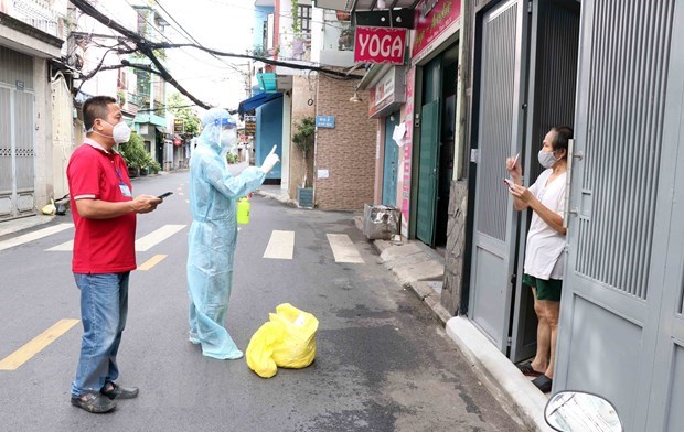 Bác sỹ Quân y Học viện Quân y (thứ 2 từ trái sang) thăm khám cho người dân tại đường Đất Thánh, phường 6, quận Tân Bình. (Ảnh: Xuân Khu/TTXVN)