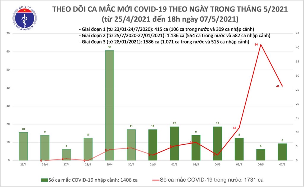 Bản tin chiều ngày 7/5 của Bộ Y tế cho biết có thêm 46 ca mắc COVID-19, trong đó 6 ca nhập cảnh được cách ly ngay, 40 ca cộng đồng, trong đó riêng Bệnh viện K có 11 ca. Đến nay, Việt Nam ghi nhận tổng cộng 3.137 bệnh nhân.