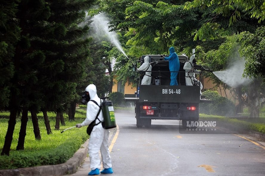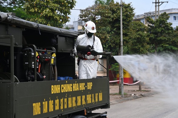 Bình chủng hoá học phun khử khuẩn tại Bệnh viện Bệnh Nhiệt đới Trung ương, nơi xuất phát chùm ca bệnh tại gần 20 tỉnh thành - Ảnh: NGUYỄN KHÁNH