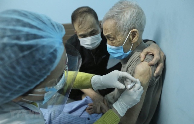 Nhân viên y tế tiêm vaccine phòng COVID-19 cho người cao tuổi phường Đồng Tâm (quận Hai Bà Trưng). Ảnh: Minh Quyết