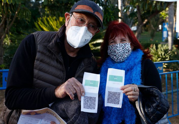 Cặp vợ chồng người Israel khoe tấm hộ chiếu vaccine tại cổng vào buổi hòa nhạc chỉ dành cho người đã tiêm vaccine COVID-19