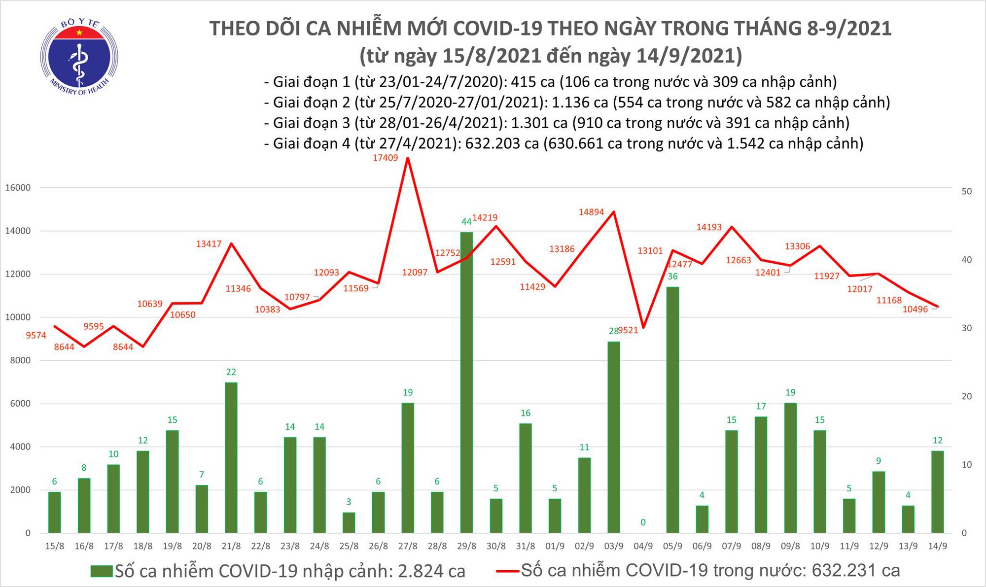 Bản tin dịch COVID-19 ngày 14/9 của Bộ Y tế cho biết, có thêm 10.508 ca mắc COVID-19, trong đó riêng TP HCM và Bình Dương đã gần 8.500 ca. Trong ngày có 12.683 bệnh nhân khỏi.